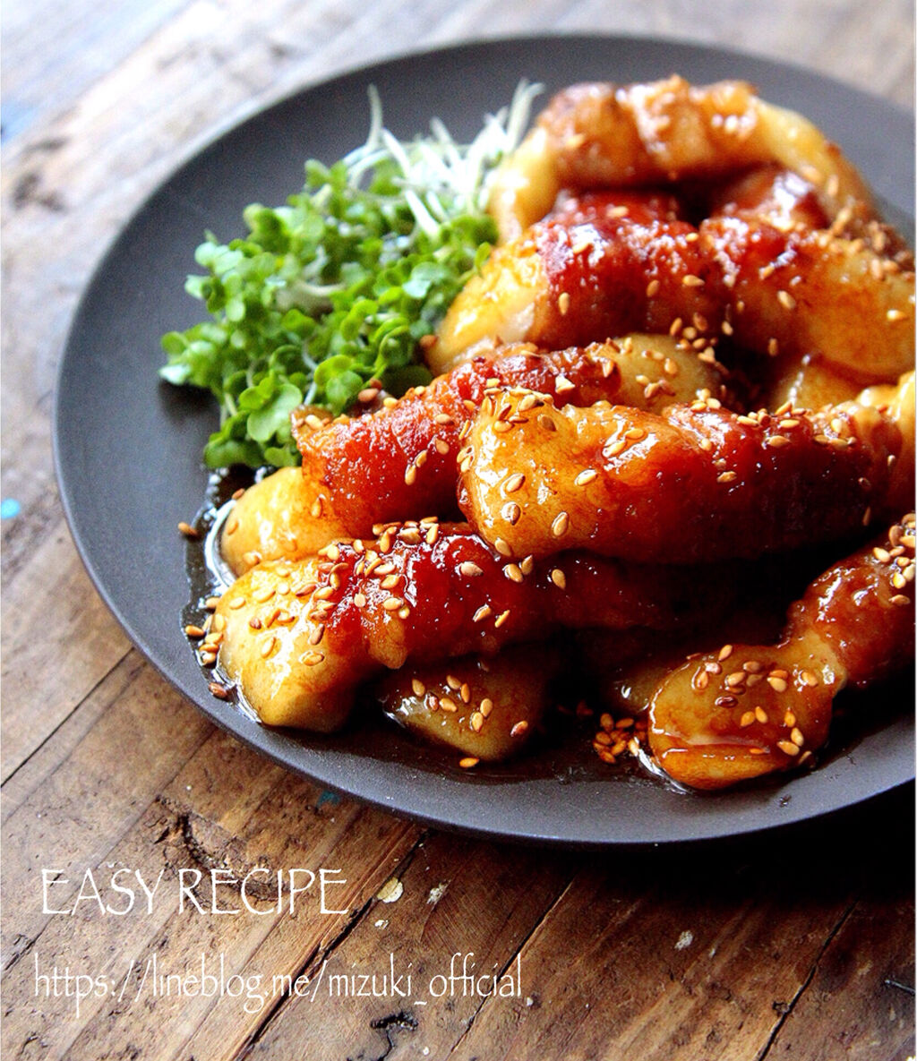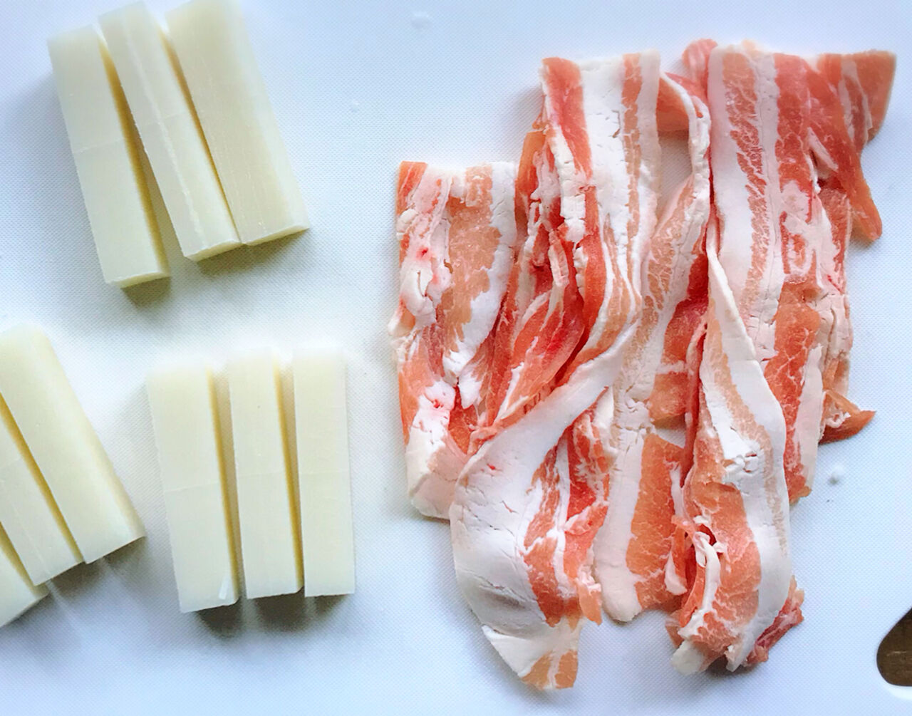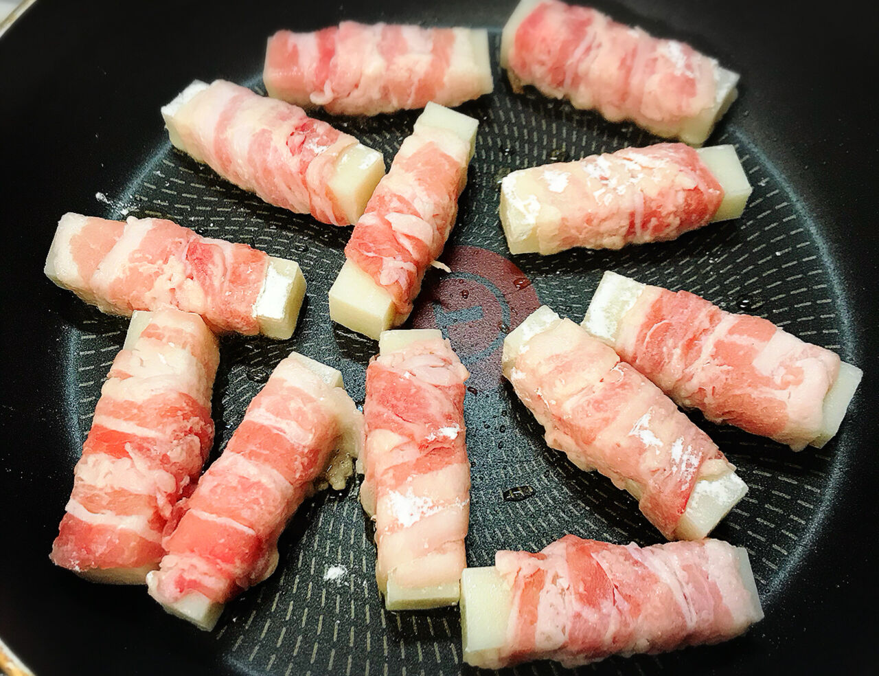 1.餅は縦3等分に切る。豚肉は長さを半分にきる。●は合わせておく。