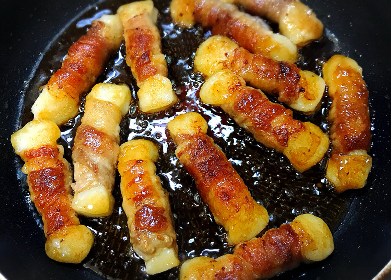3.ごま油を中火で熱したフライパンに2を並べ、転がしながら焼く。全体に焼き色がついたらフタをし、弱火で2分半~3分蒸し焼きにする。(餅同士がくっつかないようなるべく離しておくと◎)