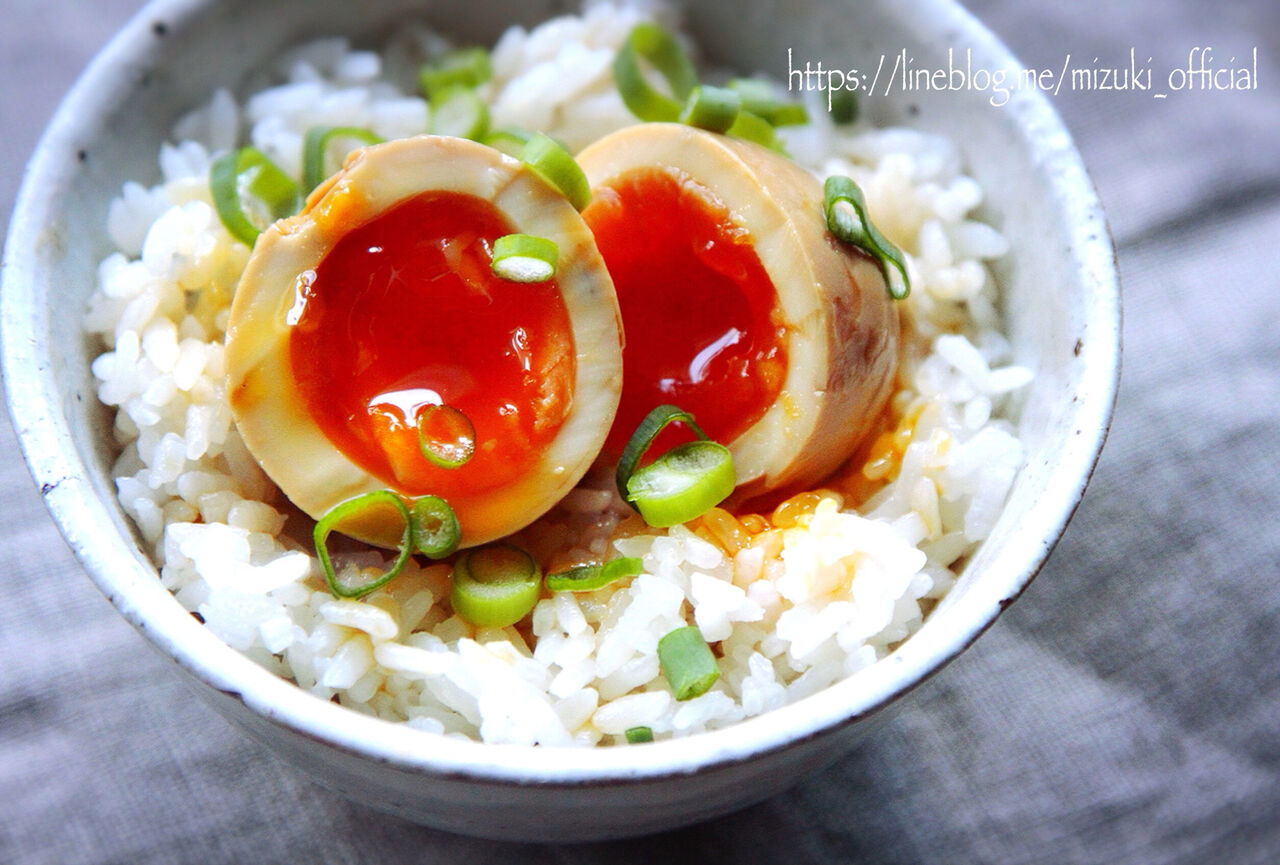 煮卵をごはんに乗せて