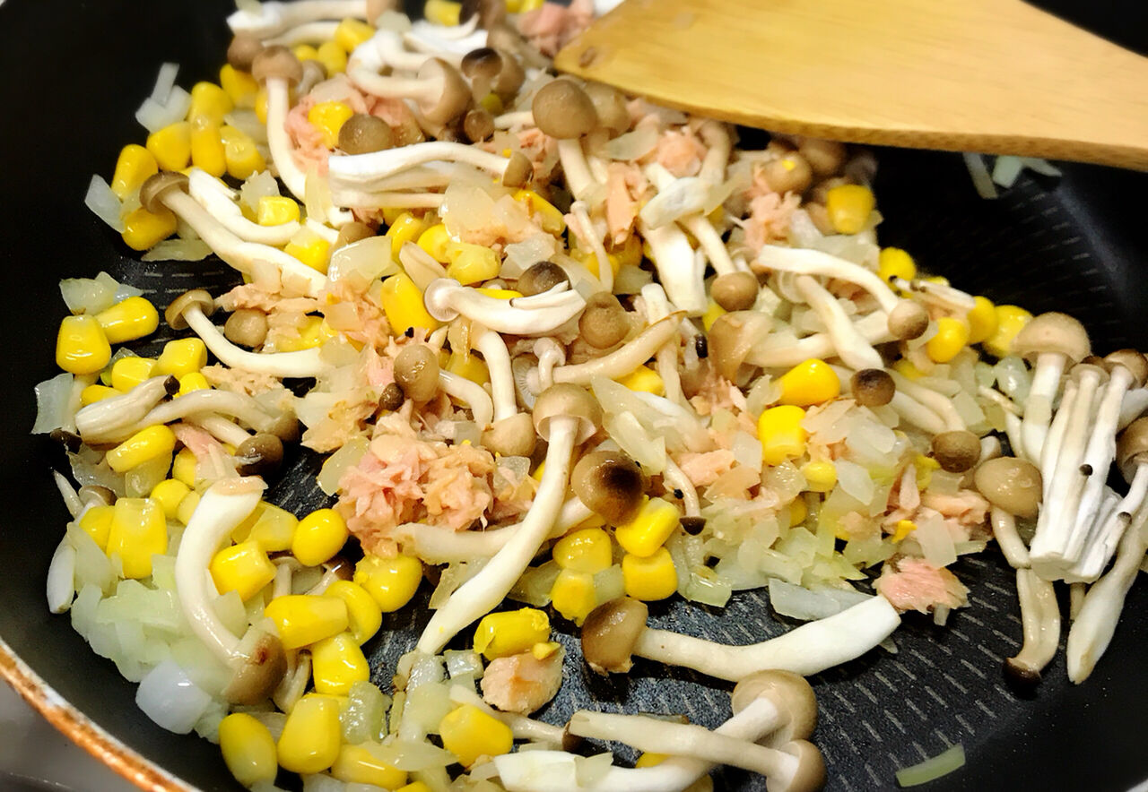 2.サラダ油を中火で熱したフライパンで玉ねぎを炒める。玉ねぎがしんなりしたら、ツナ、しめじ、コーンを加えてさっと炒めて塩こしょうを振る。