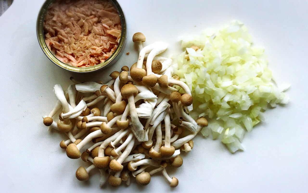 1.ツナは軽く油を切る。玉ねぎはみじん切りにし、しめじは小房に分ける。