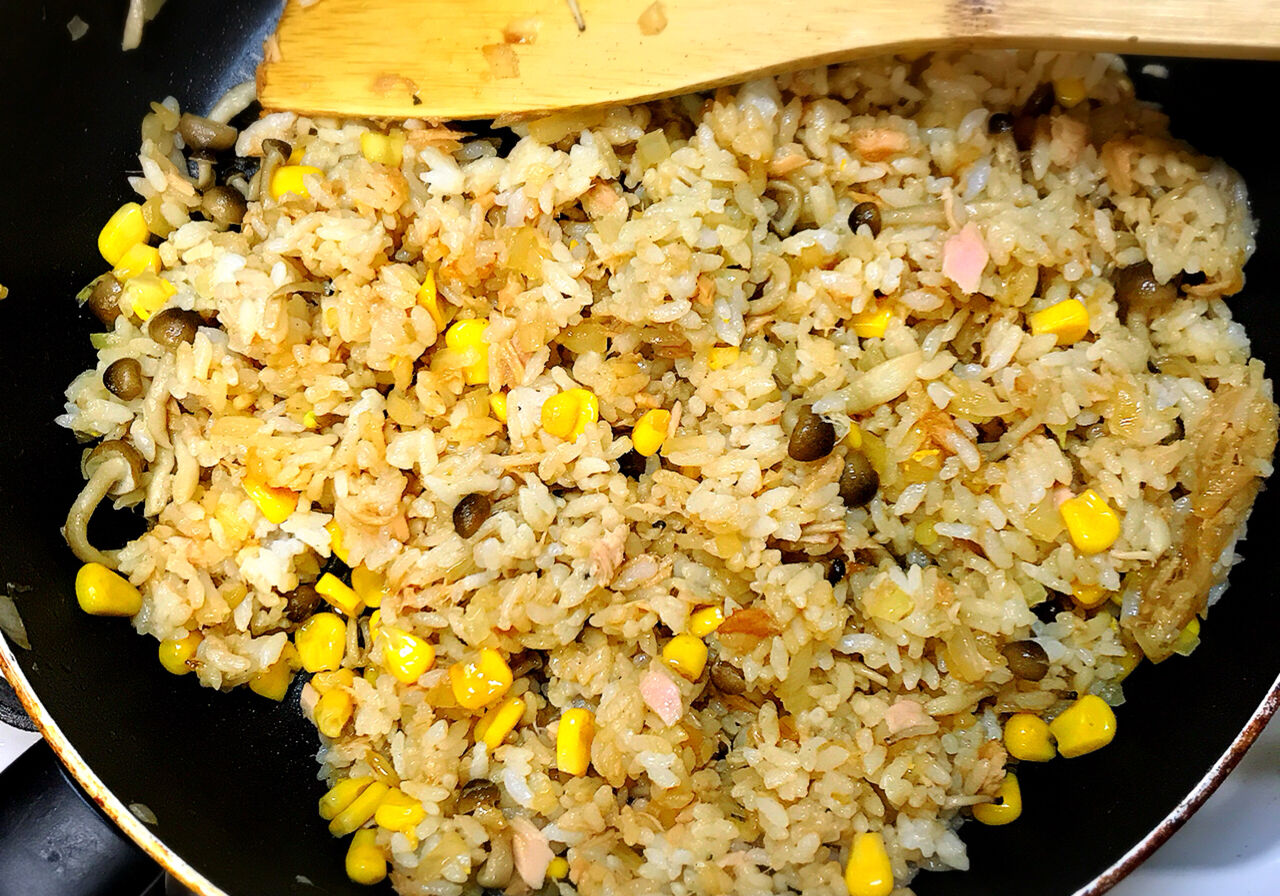 3.ごはんを加えてほぐしながら炒め、●を加えて調味する。