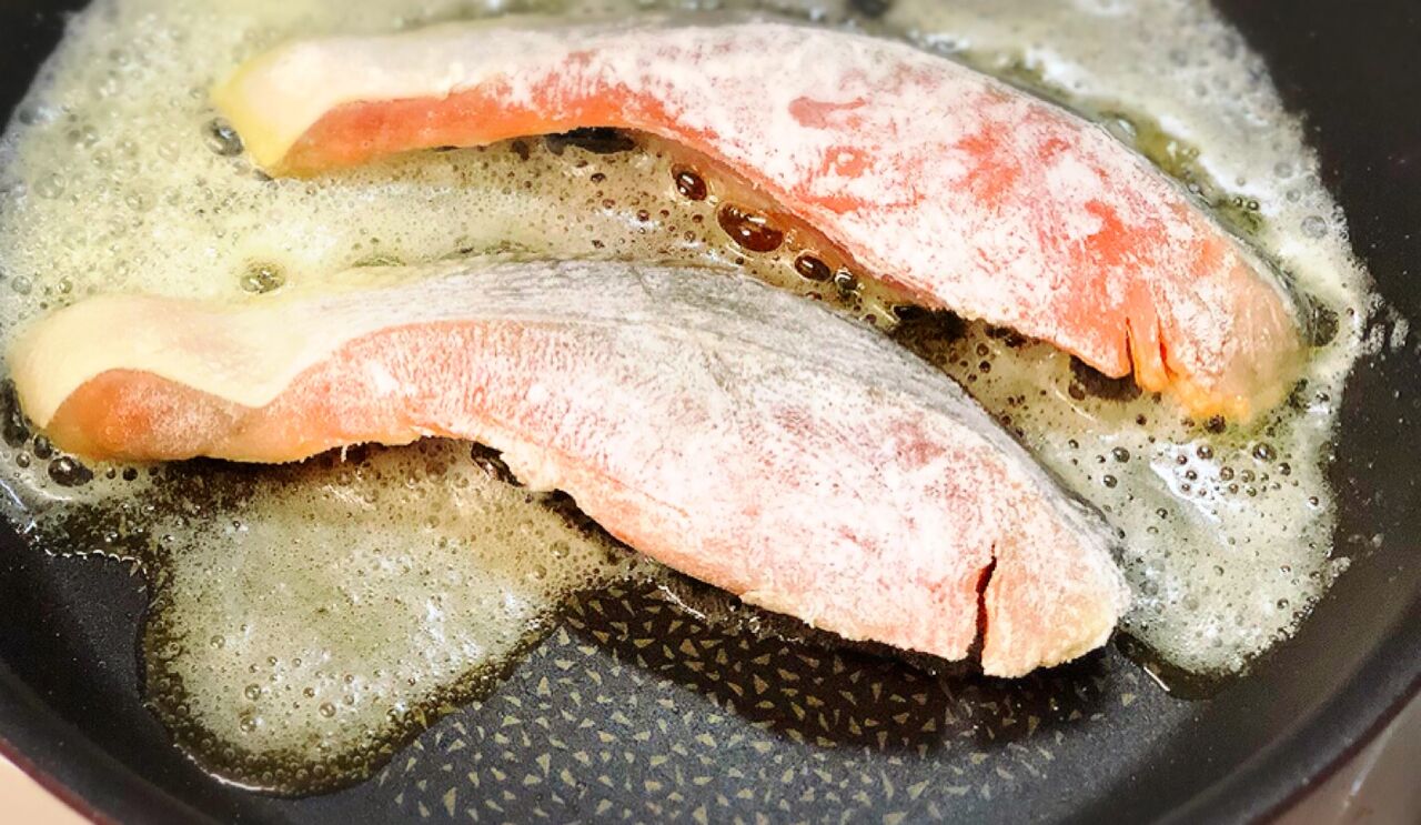 2.鮭に薄力粉をまぶし、バターを中火で熱したフライパンで両面焼いて火を通す。