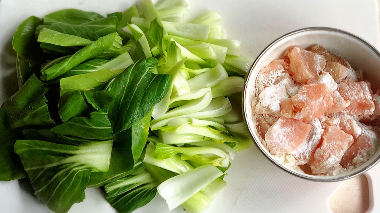 1.鶏肉は1cm厚さの削ぎ切りにし(小さめだと食べやすい)、塩こしょうを振って薄力粉をまぶす。青梗菜は長さを3等分に切り、芯の部分は縦3等分に切る。片栗粉は水大1.5で溶いて水溶き片栗粉を作っておく。