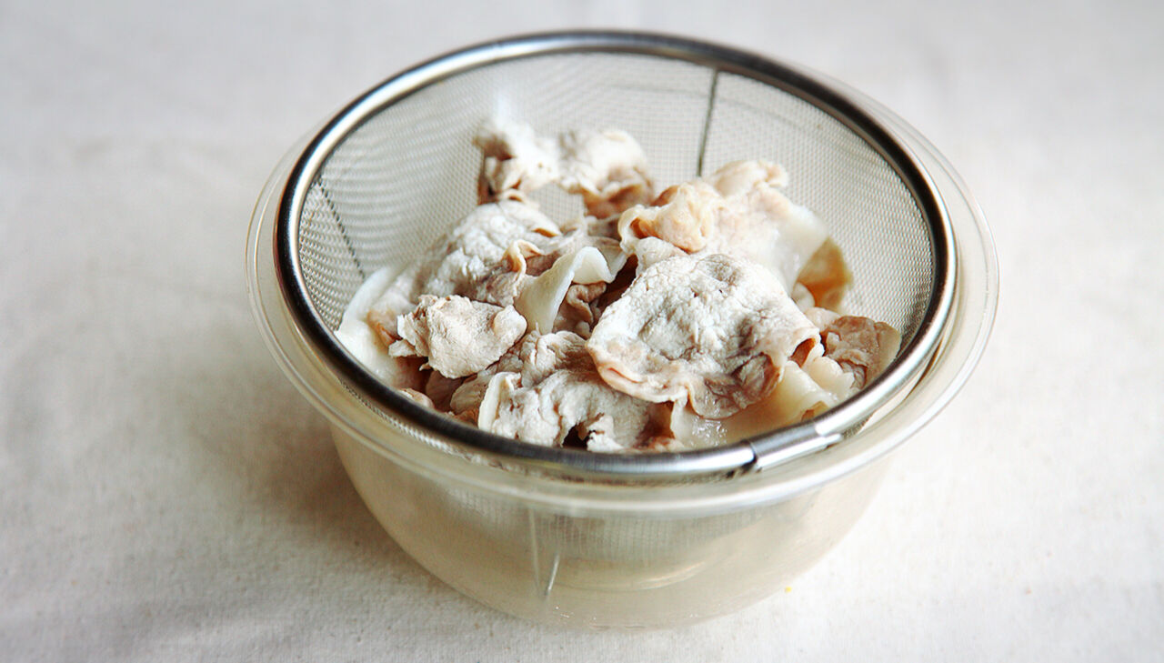 2.酒少々(分量外)を加えた熱湯で豚肉を茹で、色が変わったらすぐにザルに上げて自然に冷ます。