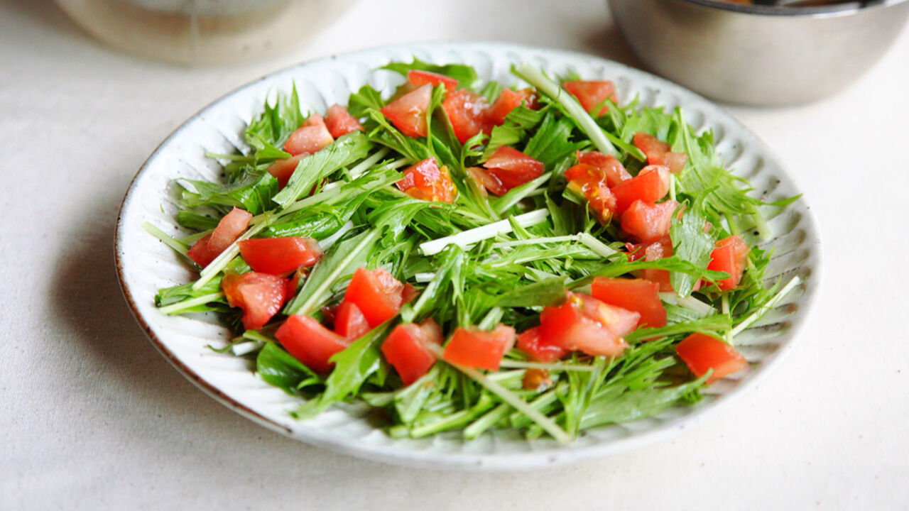 水菜は4cm長さに切り、トマトは5mm角に切って器に盛り付けておく。