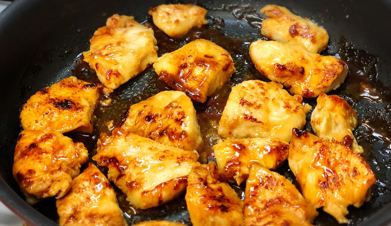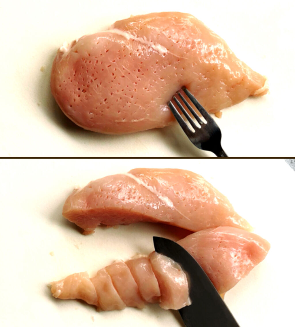 1.鶏肉全体をフォークで刺し、1cm厚さの削ぎ切りにする。