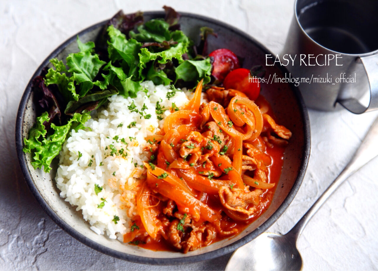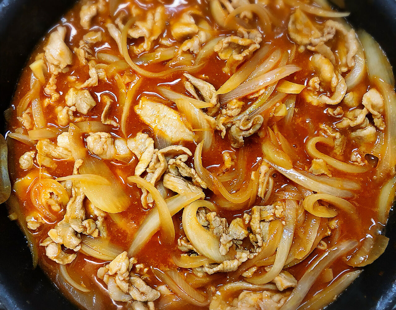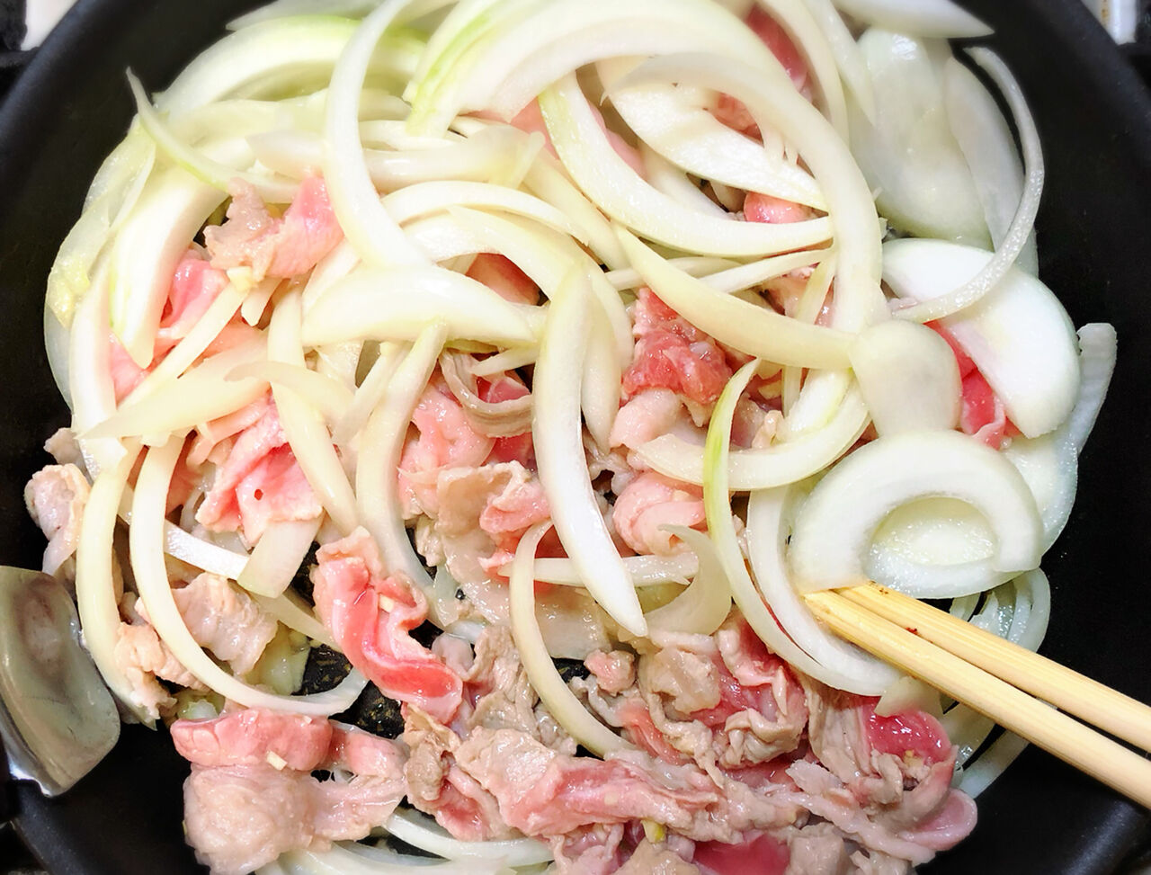 2.バターを中火で熱したフライパンで豚肉と1を炒める。豚肉の色が変わったら●を加え、混ぜながら弱火で5分煮る。