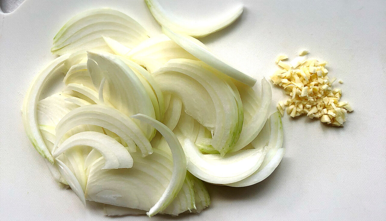 1.玉ねぎは薄切りにする。にんにくはみじん切りにする。