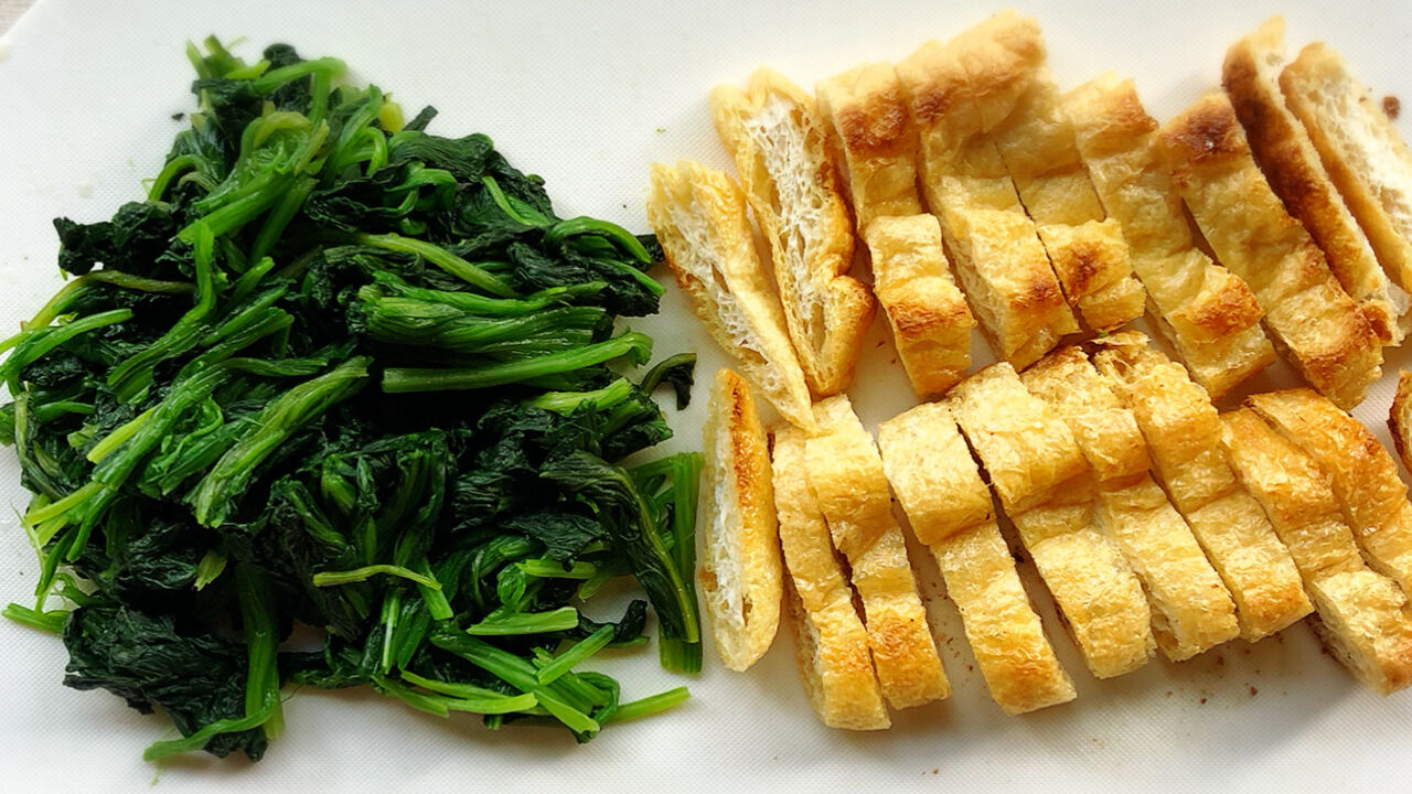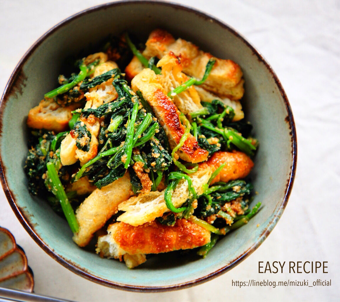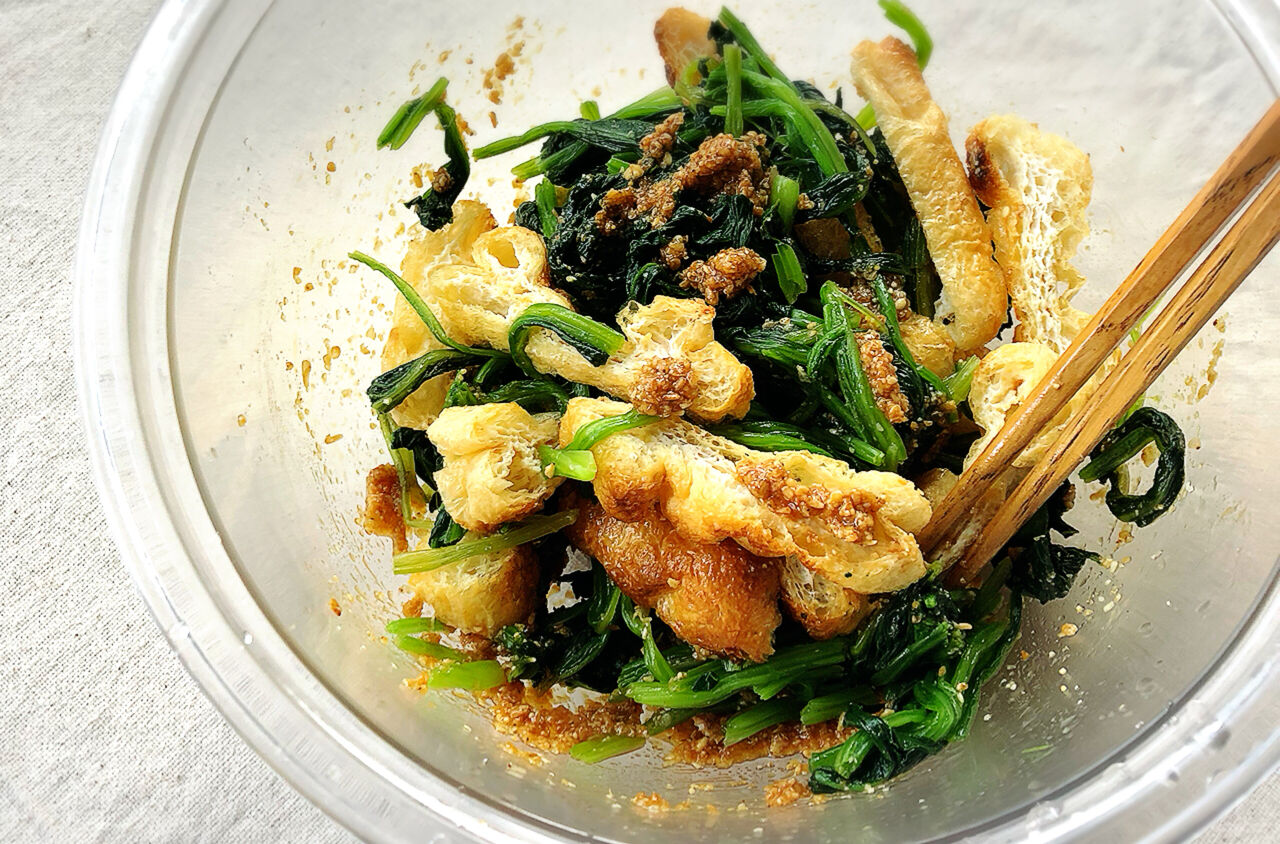 1.ほうれん草はさっと茹で、流水で冷やして水気を絞り、4cm長さに切る。油揚げはトースターでこんがり焼き、食べやすい大きさに切る。