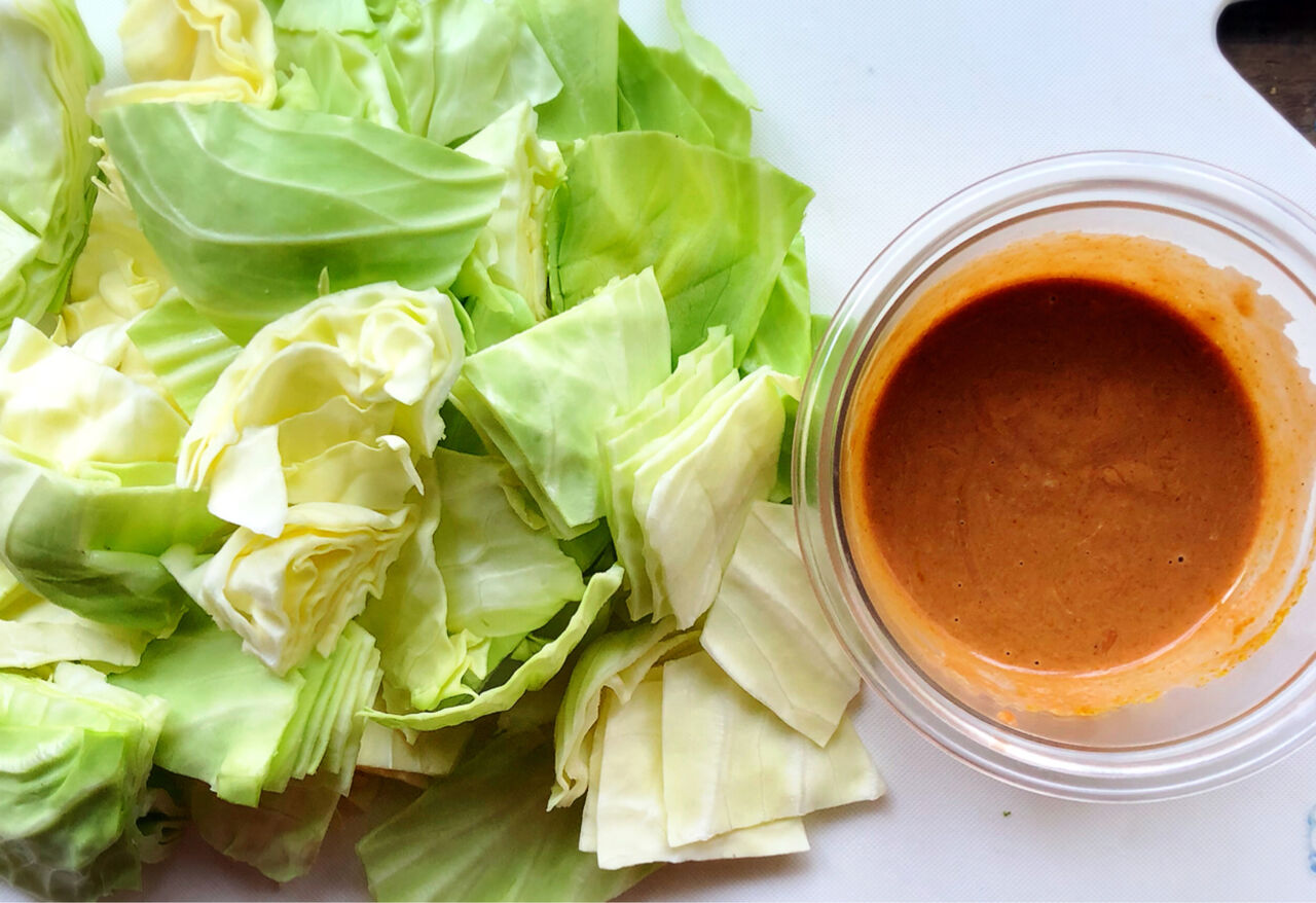 1.キャベツは4cm大に切る。●は合わせておく。