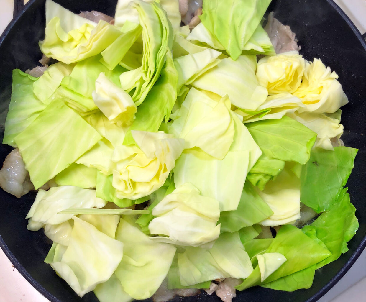 2.サラダ油を中火で熱したフライパンで豚肉を炒める。豚肉の色が変わったらキャベツを加えてフタをし、弱めの中火で3分蒸し焼きにする。