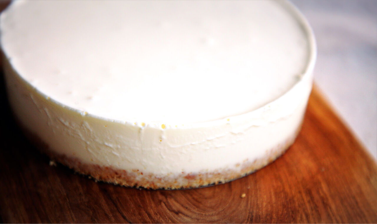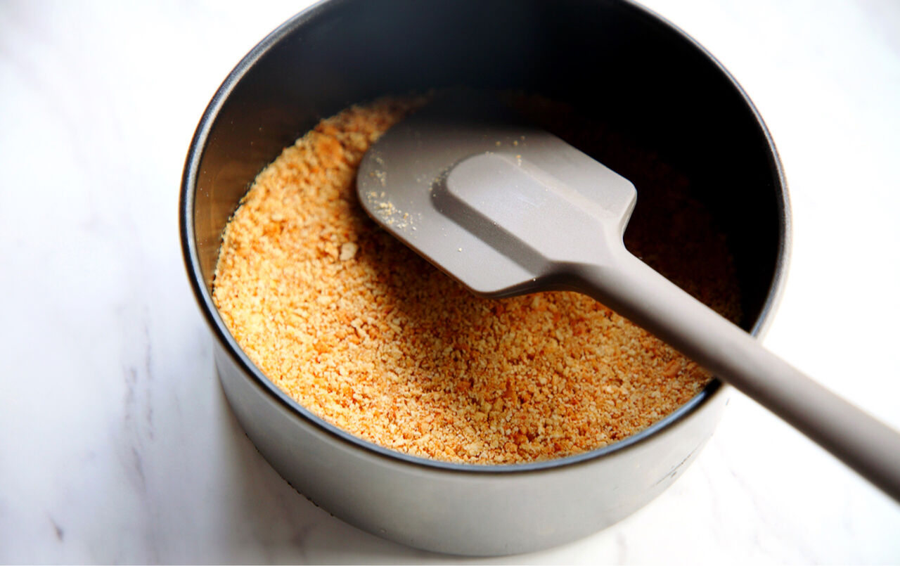 ビスケットを細かく砕き、レンジで溶かしたバターを加えて混ぜ、型の底に敷き詰めておく。