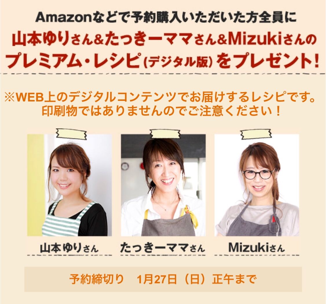 そこで発売に先がけて予約特典キャンペーンを実施いたします♪事前にネット書店の「Amazon」「楽天ブックス」から予約購入いただいた方に、誌面にも登場する"山本ゆりさん&たっきーママさん&Mizukiさんのプレミアム・レシピ(デジタル版)"をもれなく全員にプレゼント!