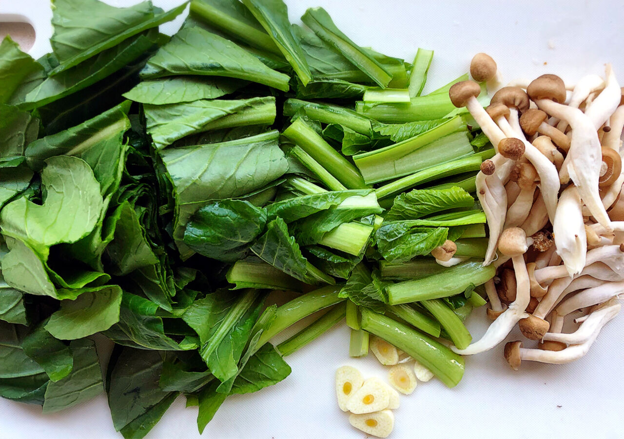 1.小松菜は4cm長さに切る。しめじは小房に分ける。にんにくは薄切りにする。