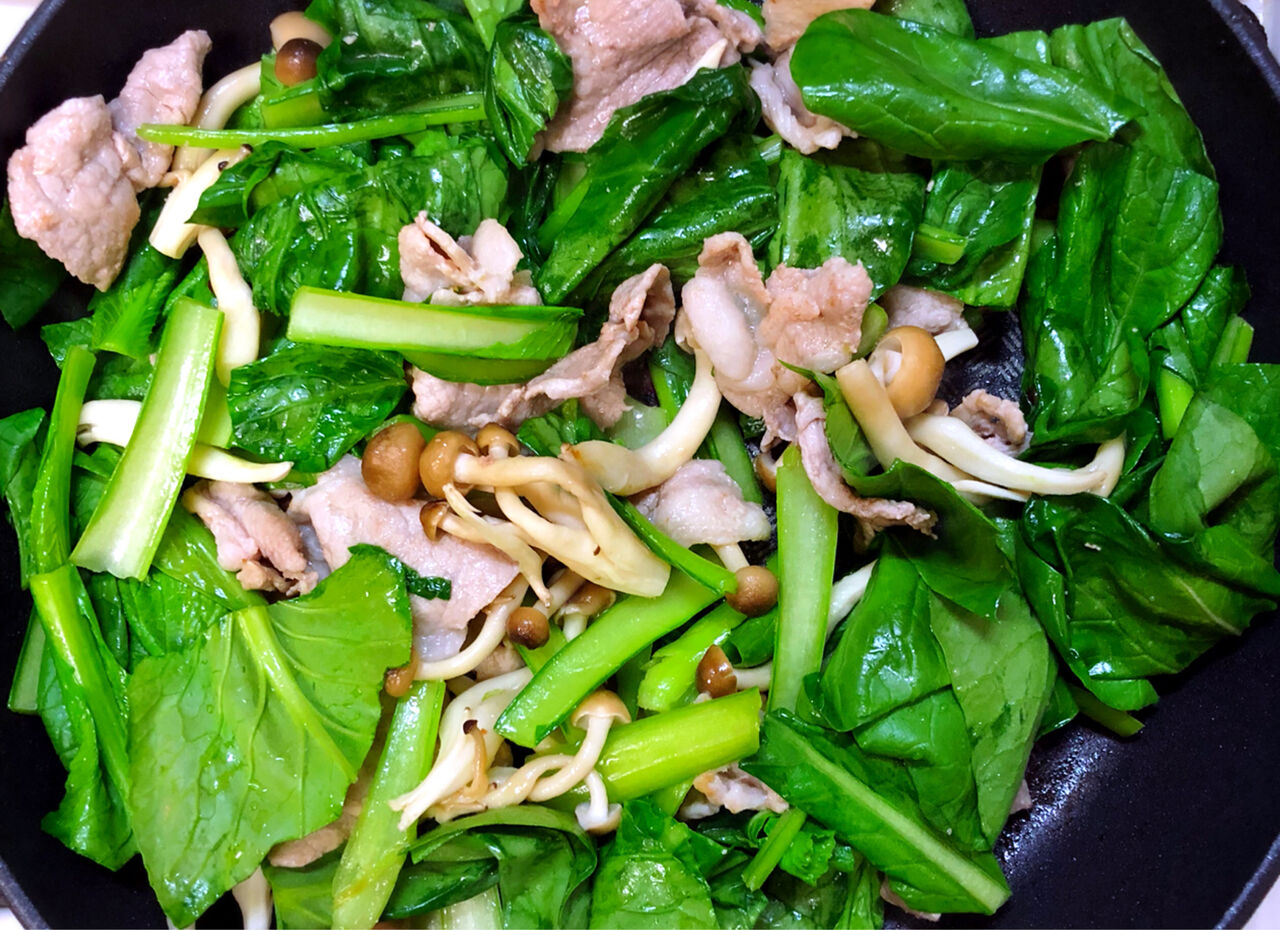 2.サラダ油を中火で熱したフライパンで豚肉とにんにくを炒める。豚肉の色が変わったら小松菜としめじを加えて更に炒める。
