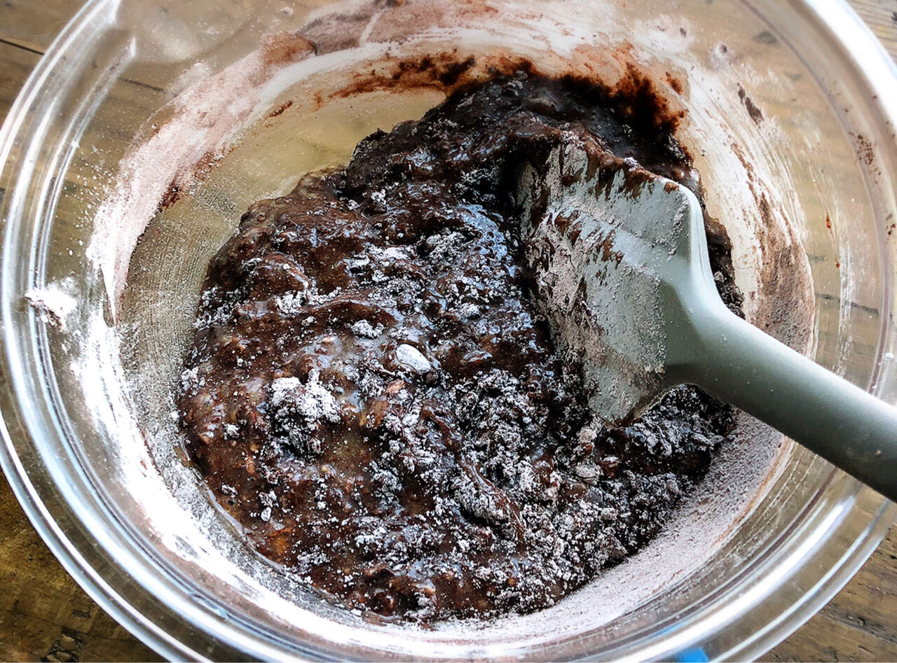 2.●とチョコ(トッピング用に少し残す)を加えてゴムベラでさっくり混ぜる。