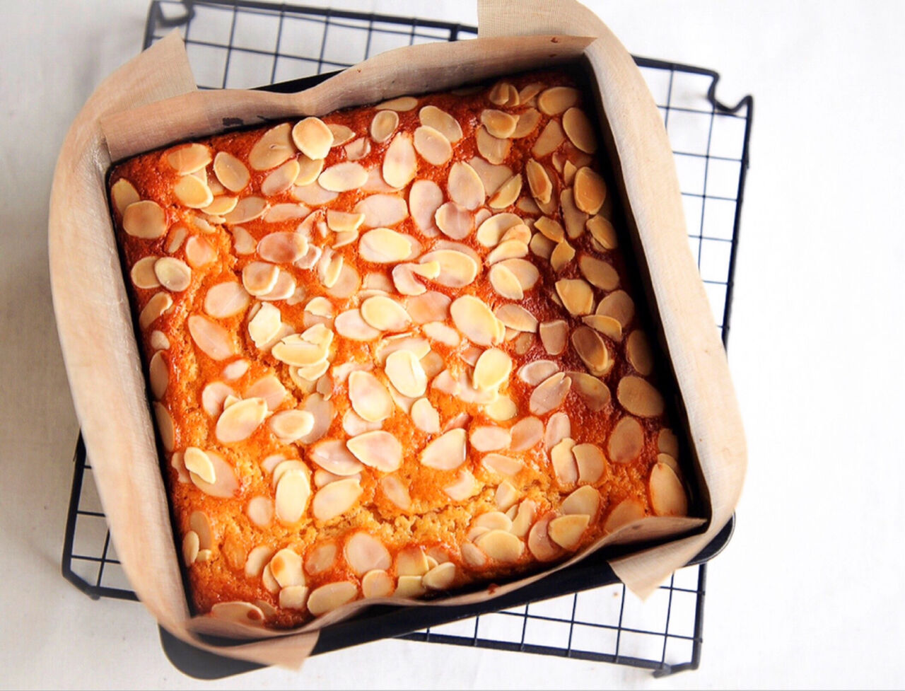 4.型に注ぎ、アーモンドスライスをのせ、予熱したオーブンで35分程焼く。焼けたらアミにのせて冷ます。