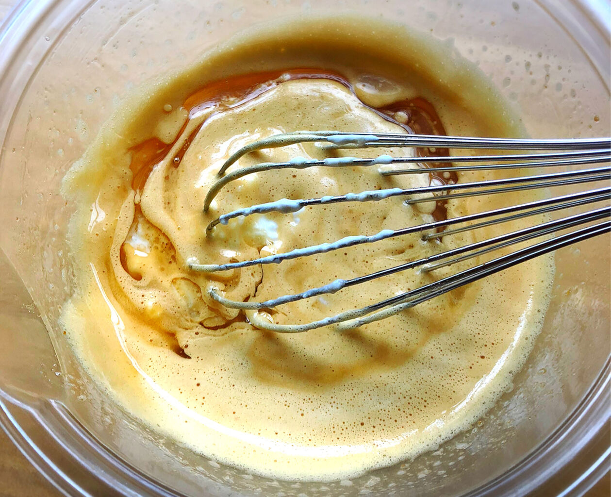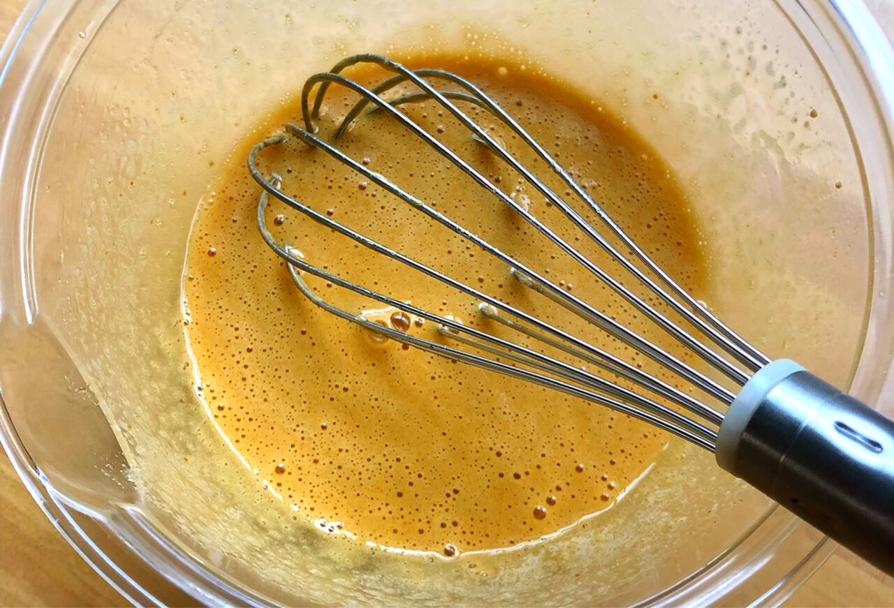 1.ボウルに卵を入れて溶きほぐし、砂糖を加えてよく混ぜる。(少しふんわりするくらいまで)