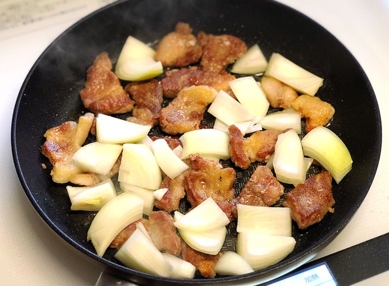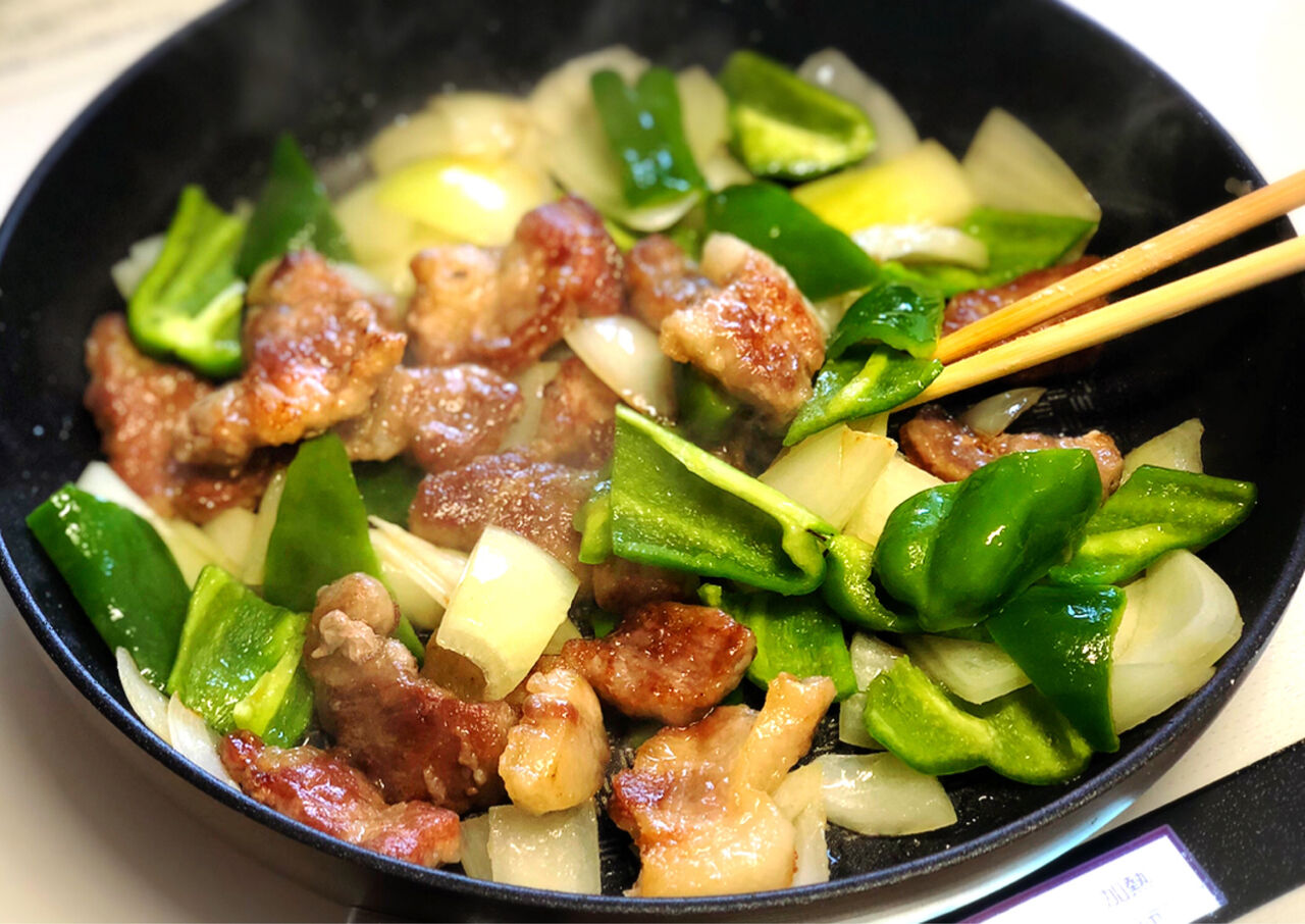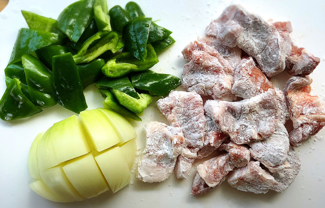 1.豚肉は一口大に切り、塩こしょうを振って片栗粉をまぶす。玉ねぎは2cm幅にスライスして長さを半分に切る。ピーマンは2cm大に切る。●は合わせておく。