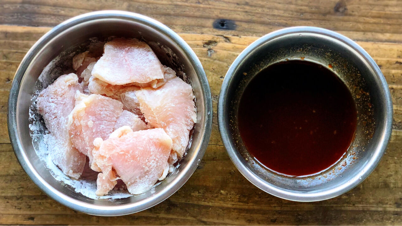 1.鶏肉は全体をフォークで刺し、1cm厚さの削ぎ切りにして●を揉み込み片栗粉をまぶす。☆は合わせておく。