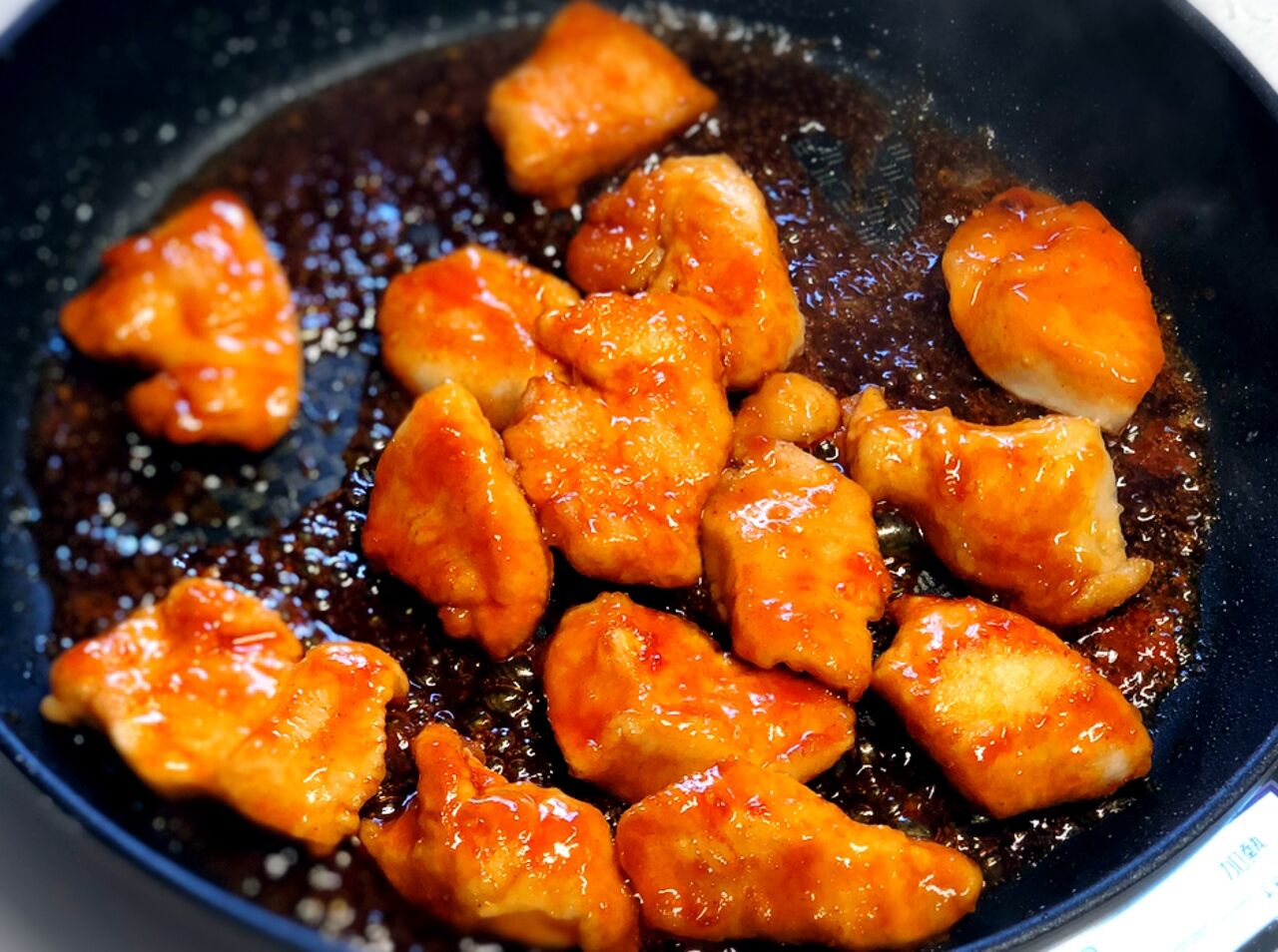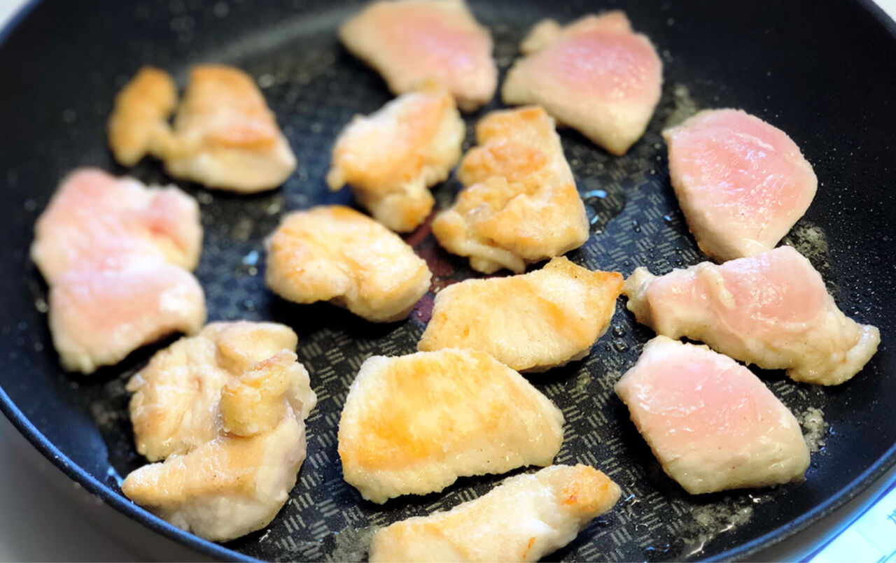 2.ごま油を中火で熱したフライパンで鶏肉を焼く。こんがりしたら裏返してフタをし、弱めの中火で2分半蒸し焼きにする。フタを外し、☆を加えて煮からめる。