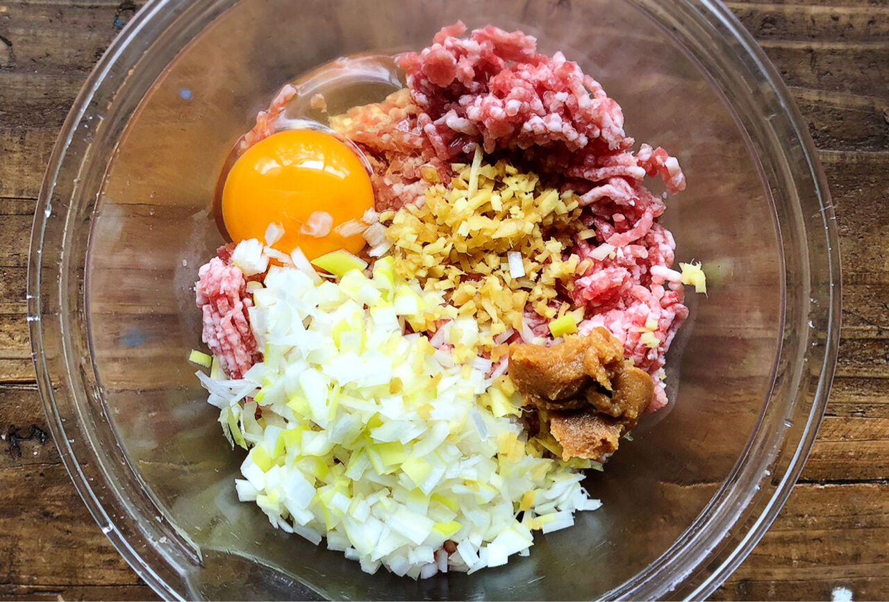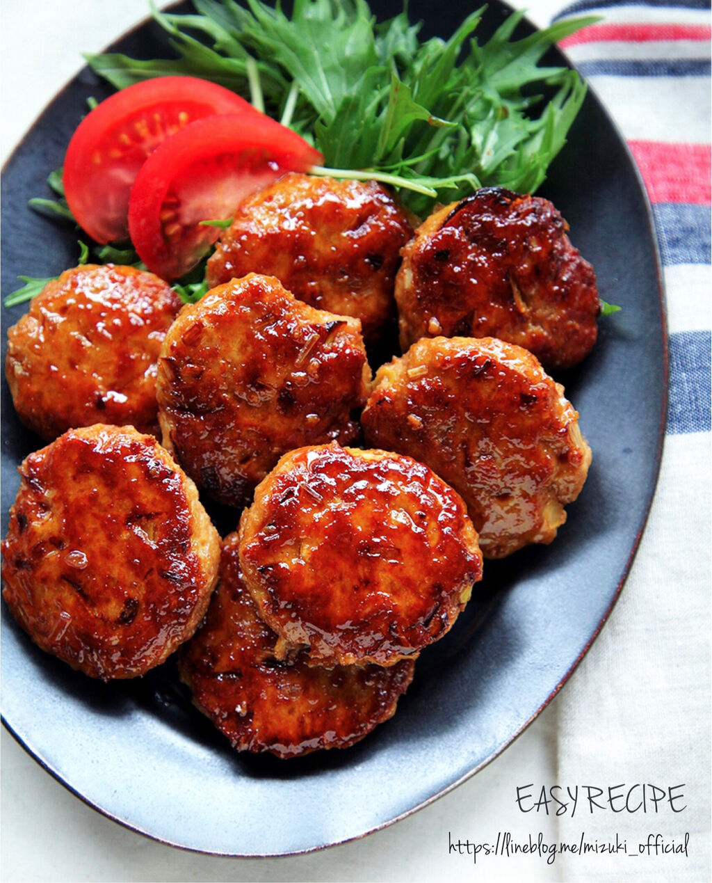 1.ボウルに●を入れてよく混ぜ、8等分の小判形にする。