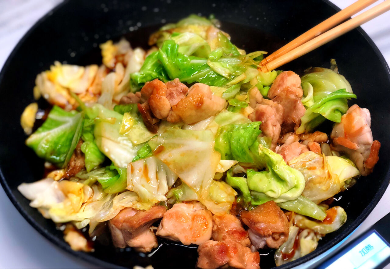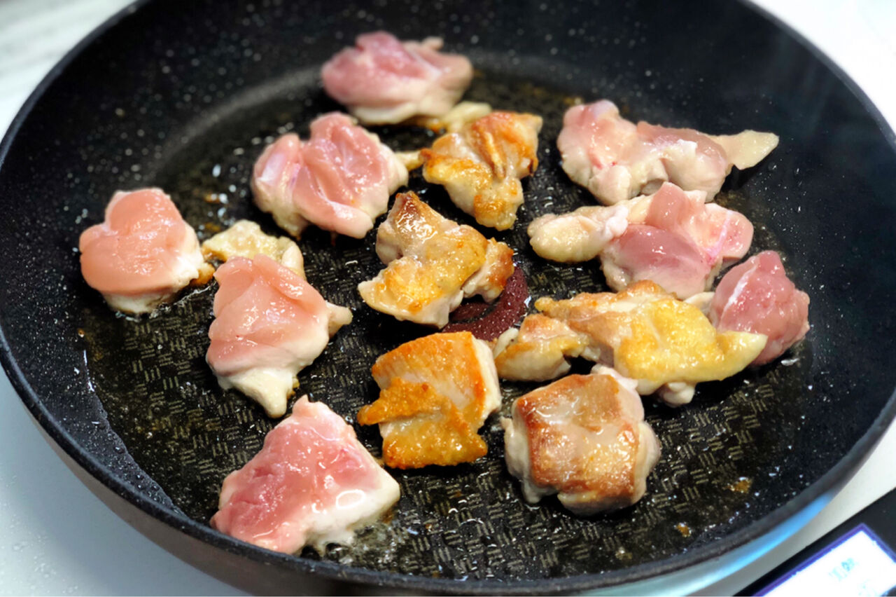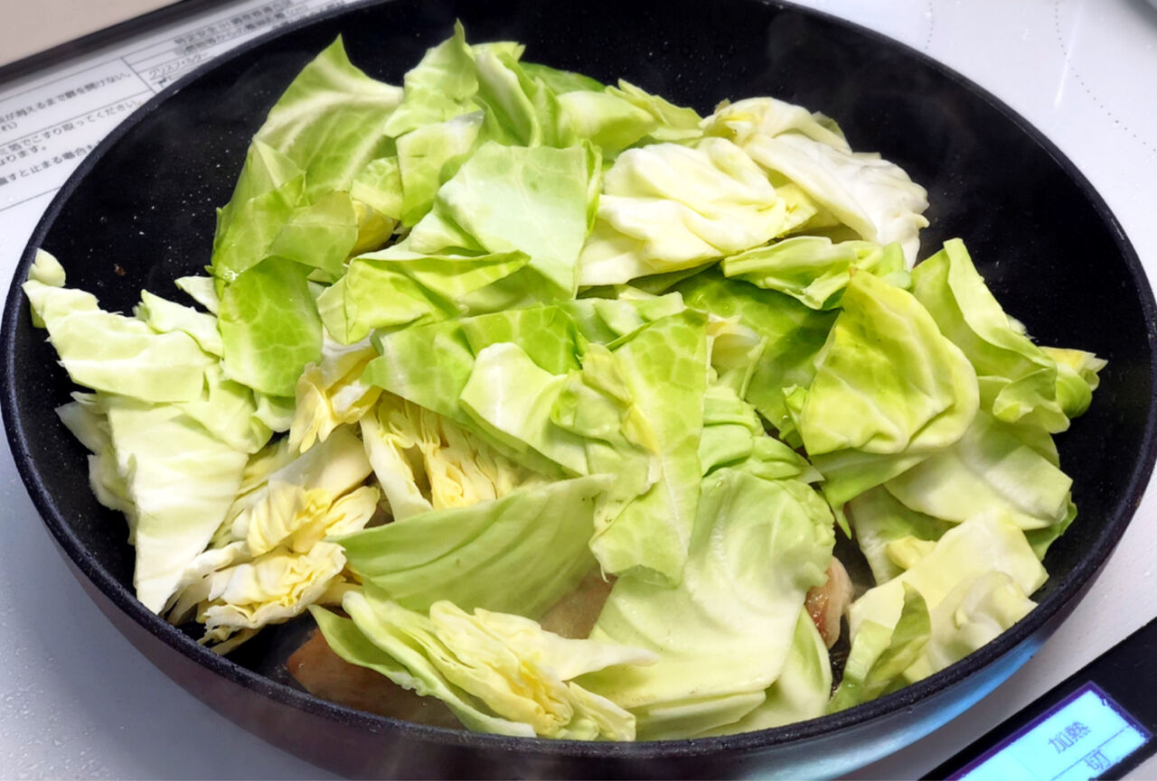 2.サラダ油を中火で熱したフライパンで鶏肉を焼く。こんがりしたら裏返してキャベツを加え、フタをして弱めの中火で3分蒸し焼きにする。