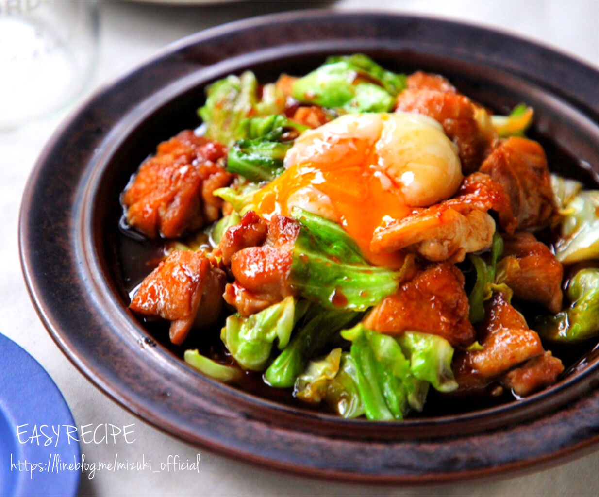 3.フタを外して炒め合わせ、キャベツがしんなりしたら●を加えて煮からめる。器に盛り、温玉をトッピングする。