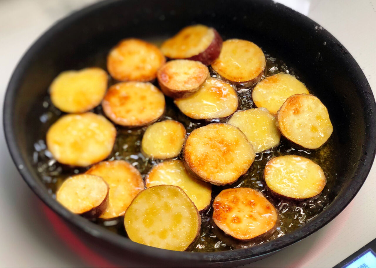 2.フライパンに3mmのサラダ油を入れて中火で熱し、1を両面色よく揚げ焼きにする。さつまいもが柔らかくなったら引き上げて油を切る。