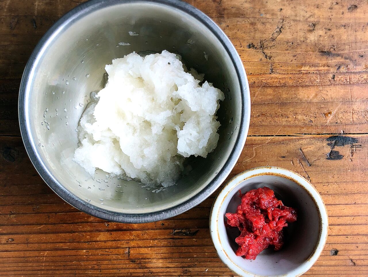 3.2に大根おろしと梅を乗せ、ぽん酢をかける。(あれば)小口切りにしたねぎをトッピングする。