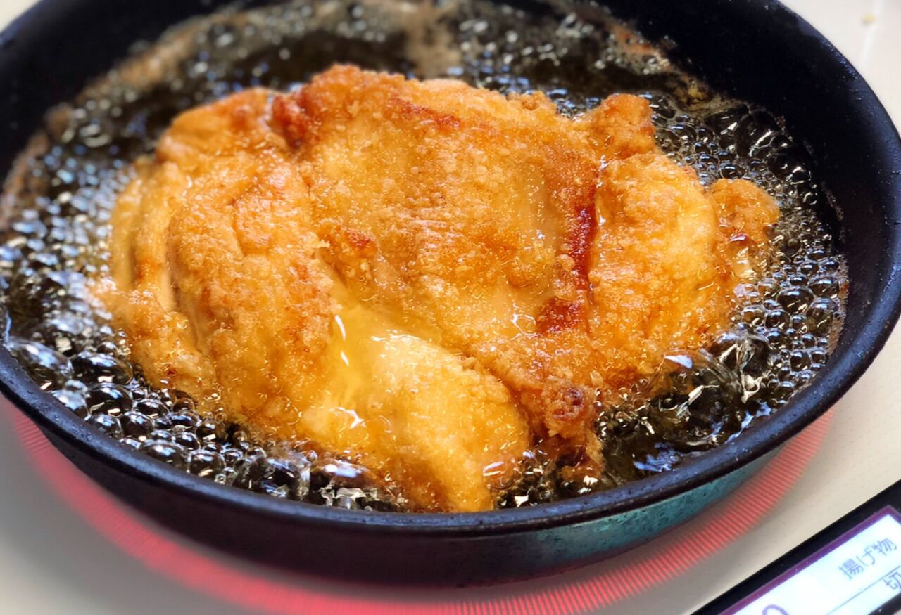 2.(小さめの)フライパンに5mmのサラダ油を中火で熱し、鶏肉を入れ、両面色よく揚げ焼きにする。火が通ったら油を切り、食べやすい大きさに切って器に盛り付ける。
