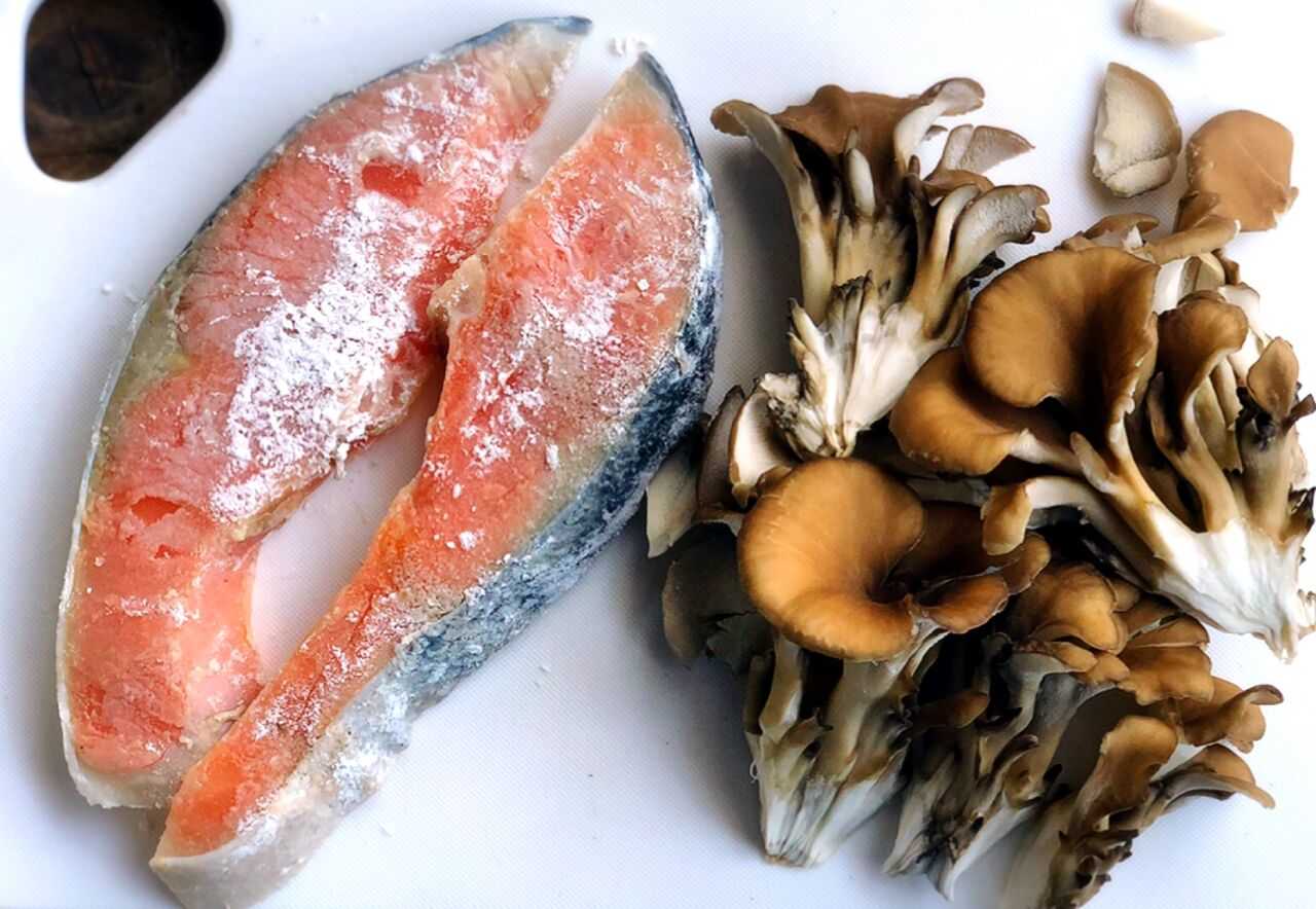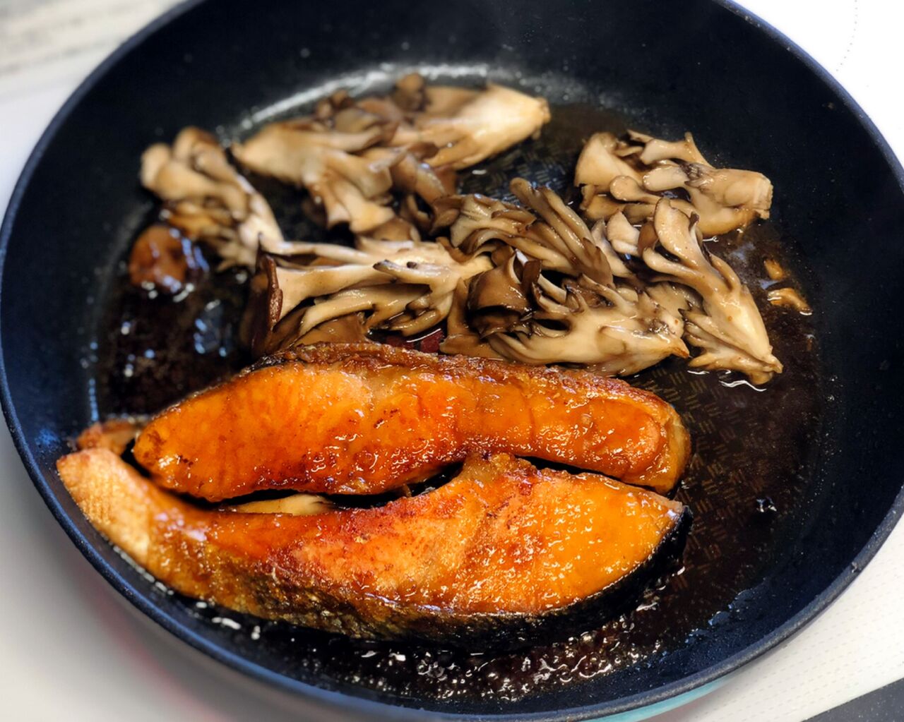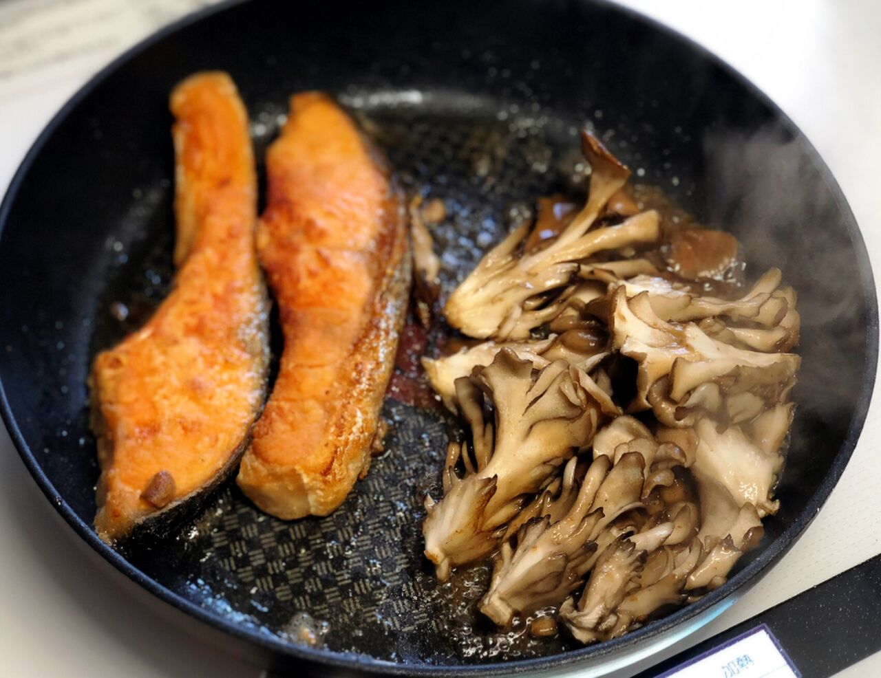 2.フライパンにサラダ油とバターを入れて中火で熱し、鮭を両面色よく焼く。8割方火が通ったら端に寄せ、空いたところでまいたけを炒める。