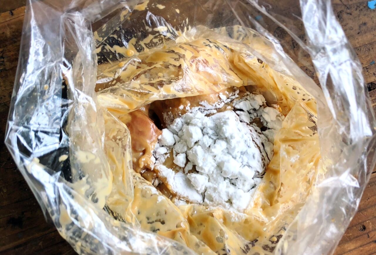 1.鶏肉は4cm大に切ってポリ袋に入れ、●を揉み込み5分置く。ポリ袋の中に薄力粉を加えて揉み込み、続けて片栗粉も加えて揉み込む。
