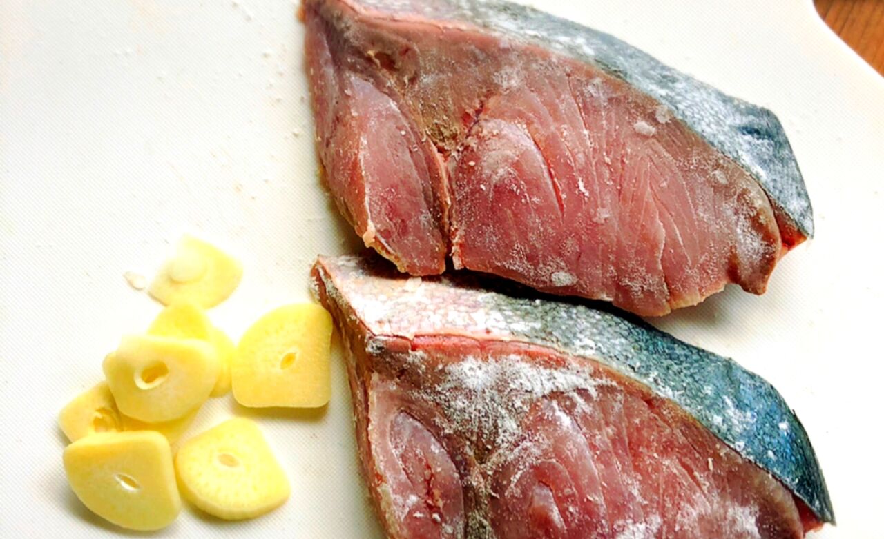 1.ぶりの両面に塩を振って5分置き、出てきた水分をペーパータオルで拭き取り、薄力粉をまぶす。にんにくは薄切りにする。