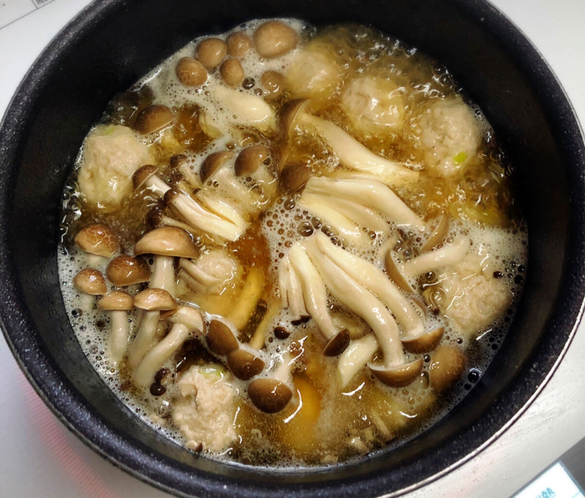 2.鍋に☆を入れて火にかける。沸騰したら1の肉だねを3cm大に丸めて入れ、中火で3分煮る。続けてしめじも加え、たまに混ぜながら更に3分煮る。
