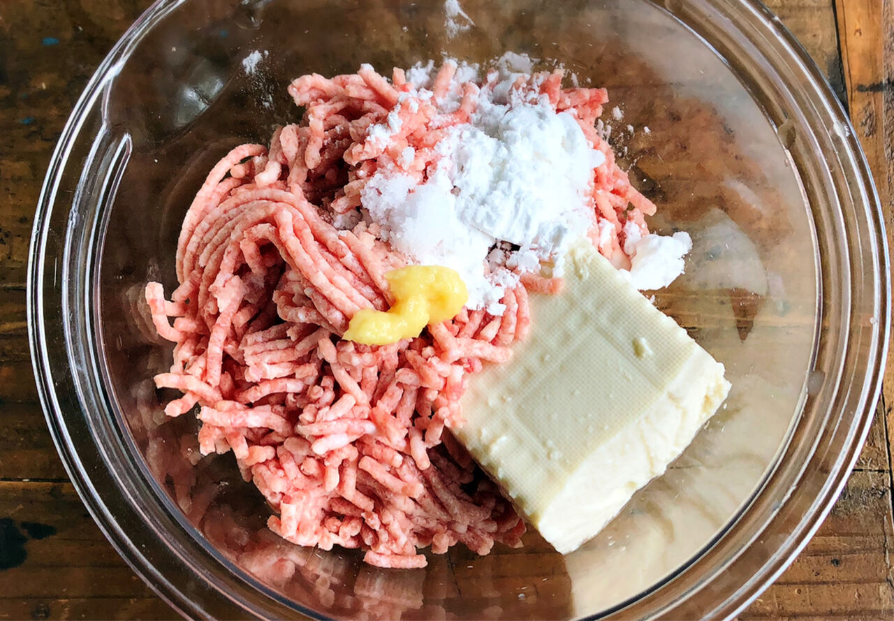 1.ボウルに●を入れてよく混ぜ、4等分の小判形にする。しめじはほぐす。☆は合わせておく。