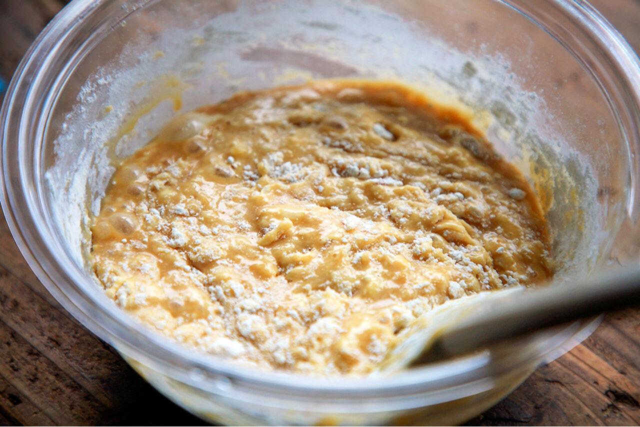 卵、牛乳、砂糖、オイルを一気に混ぜる。