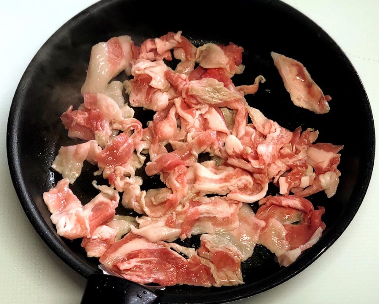 フライパンにゴマ油を入れて中火で熱し、豚肉を炒める。色が変わったら●を加えて煮からめる。