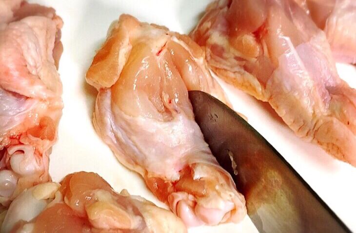 1.手羽元は骨に沿って包丁で一本切り込みを入れる。生姜は薄切りにする。