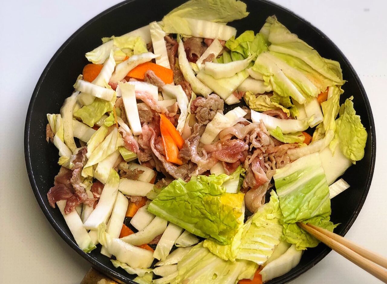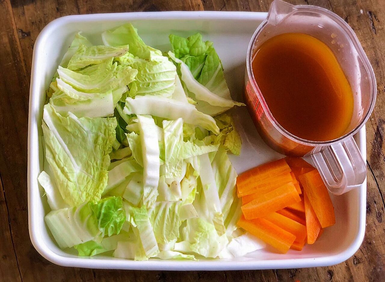 1.白菜の芯は1cm幅に切り、葉はザク切りにする。人参は3mm厚さの短冊切りにする。●は合わせておく。