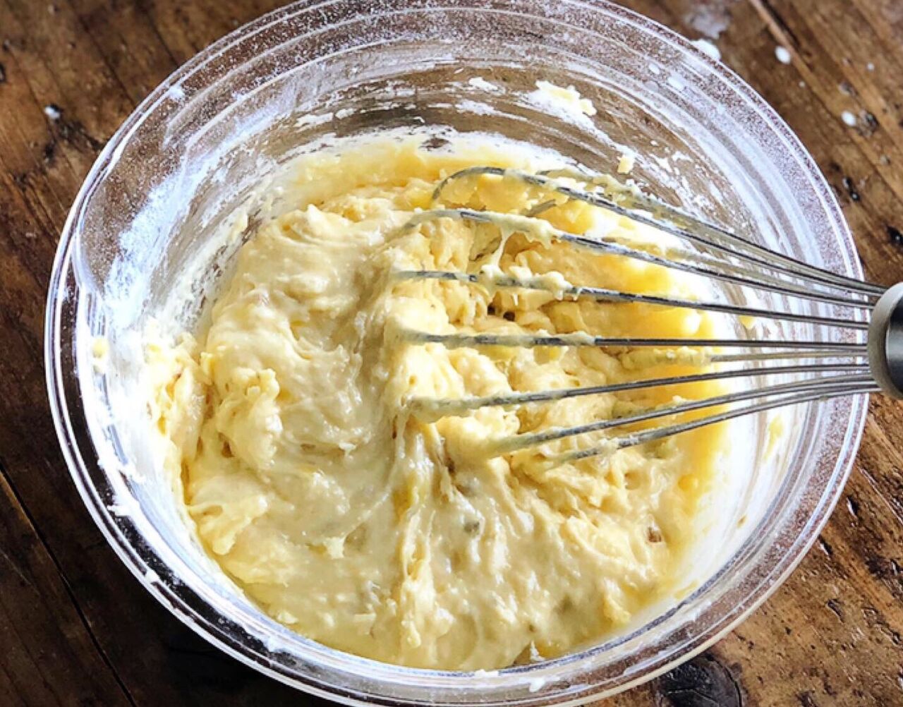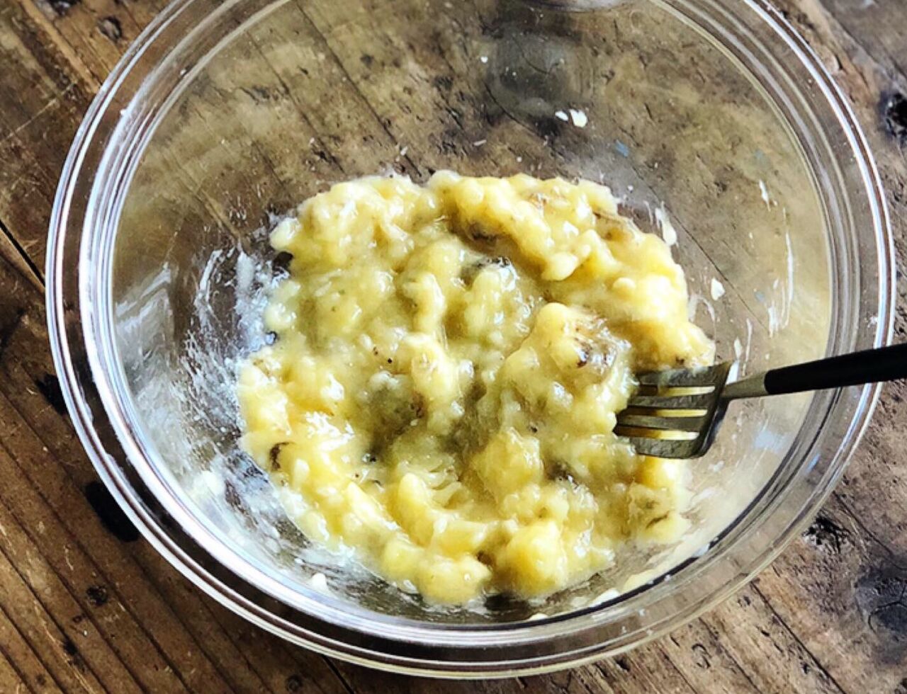1.ボウルにバナナを入れ、フォークでペースト状に潰す。卵を加えて混ぜ、最後にホットケーキミックスも加えて混ぜる。