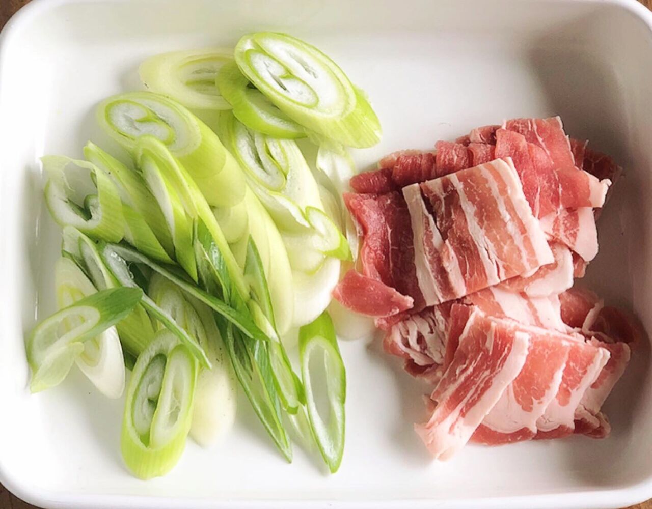 1.豚肉は3cm長さに切る。長ねぎは斜め薄切りにする。中華麺は袋の表示通りに茹で、冷水で冷やして水気を切る。