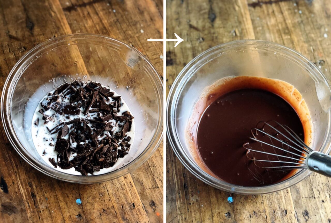 1.耐熱ボウルにチョコと牛乳を入れ、600Wのレンジで1分加熱し、混ぜて溶かす。