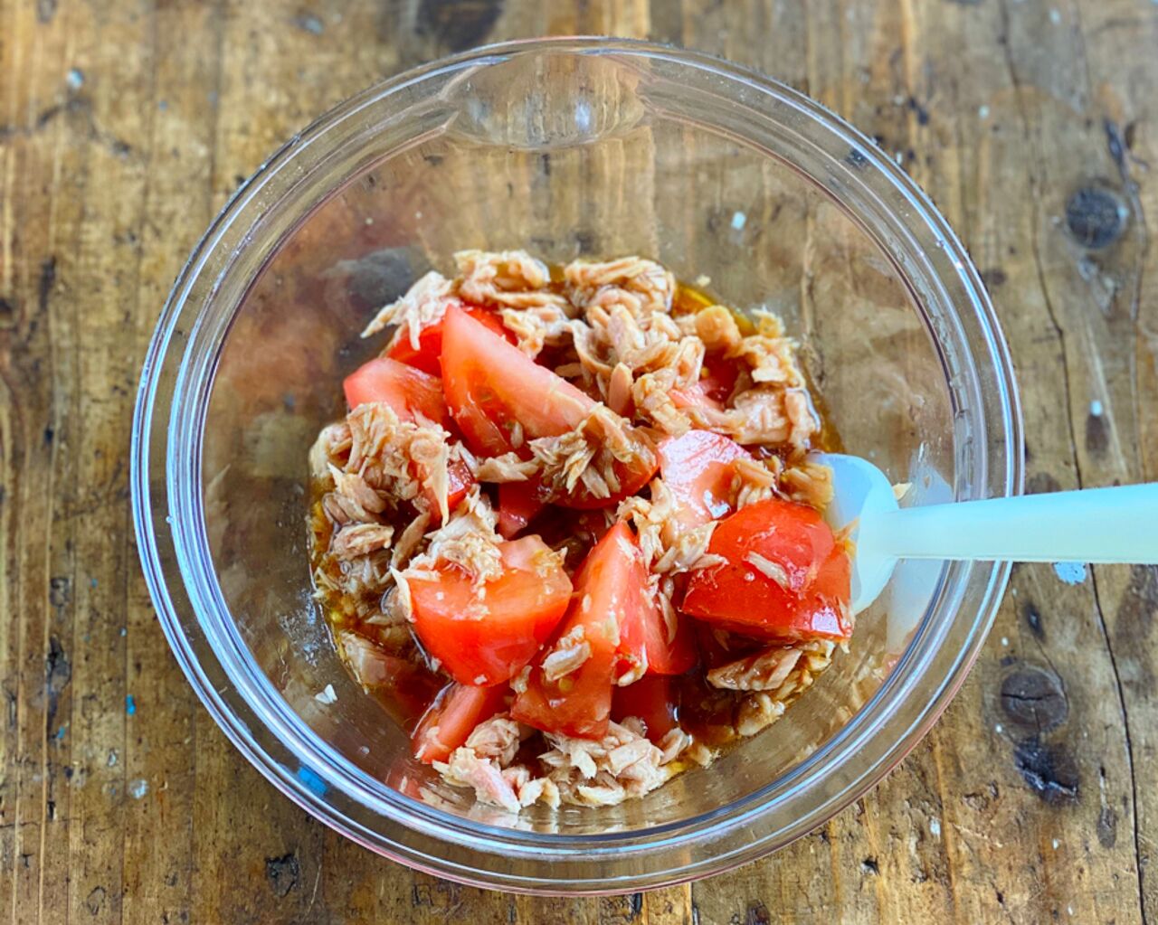 1.ツナは軽く油を切り、トマトは一口大に切る。ボウルにツナ、トマト、●を入れて混ぜておく。