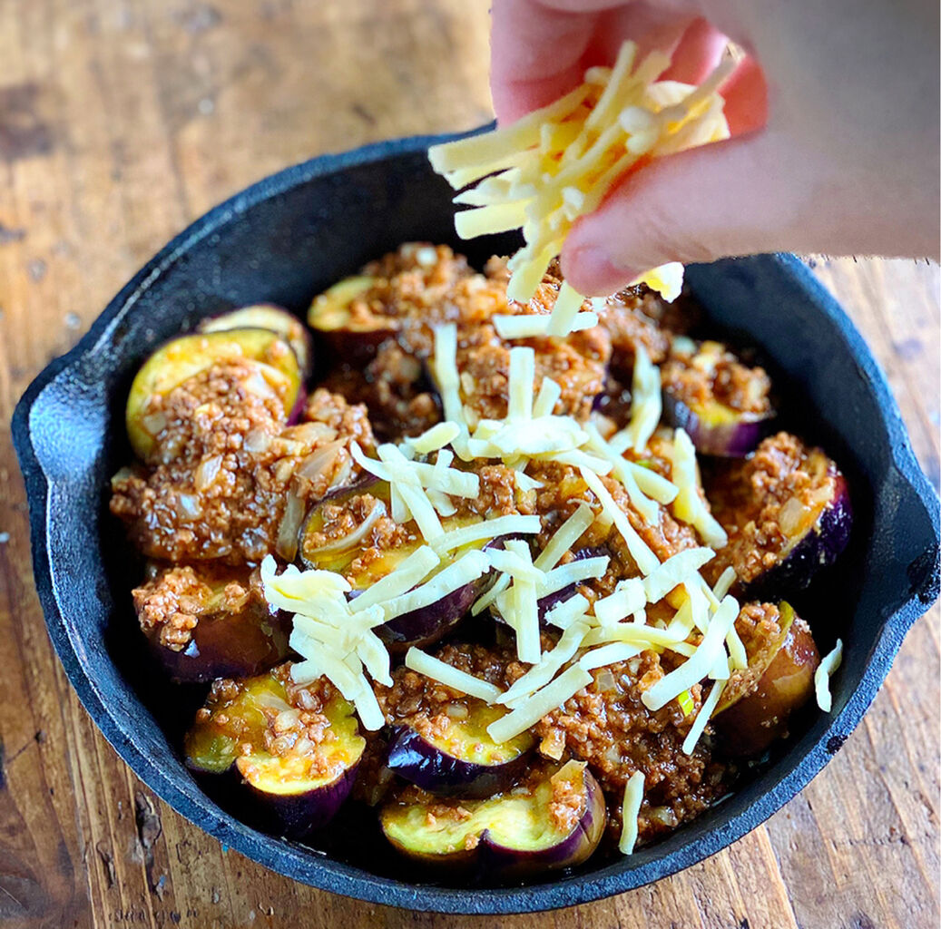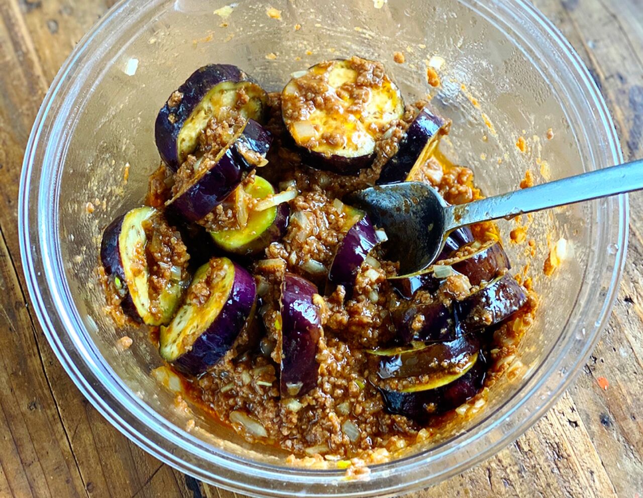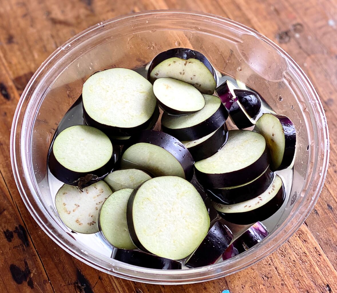 1.なすは1cm厚さの輪切りにし、水に3分晒して水気を切る。