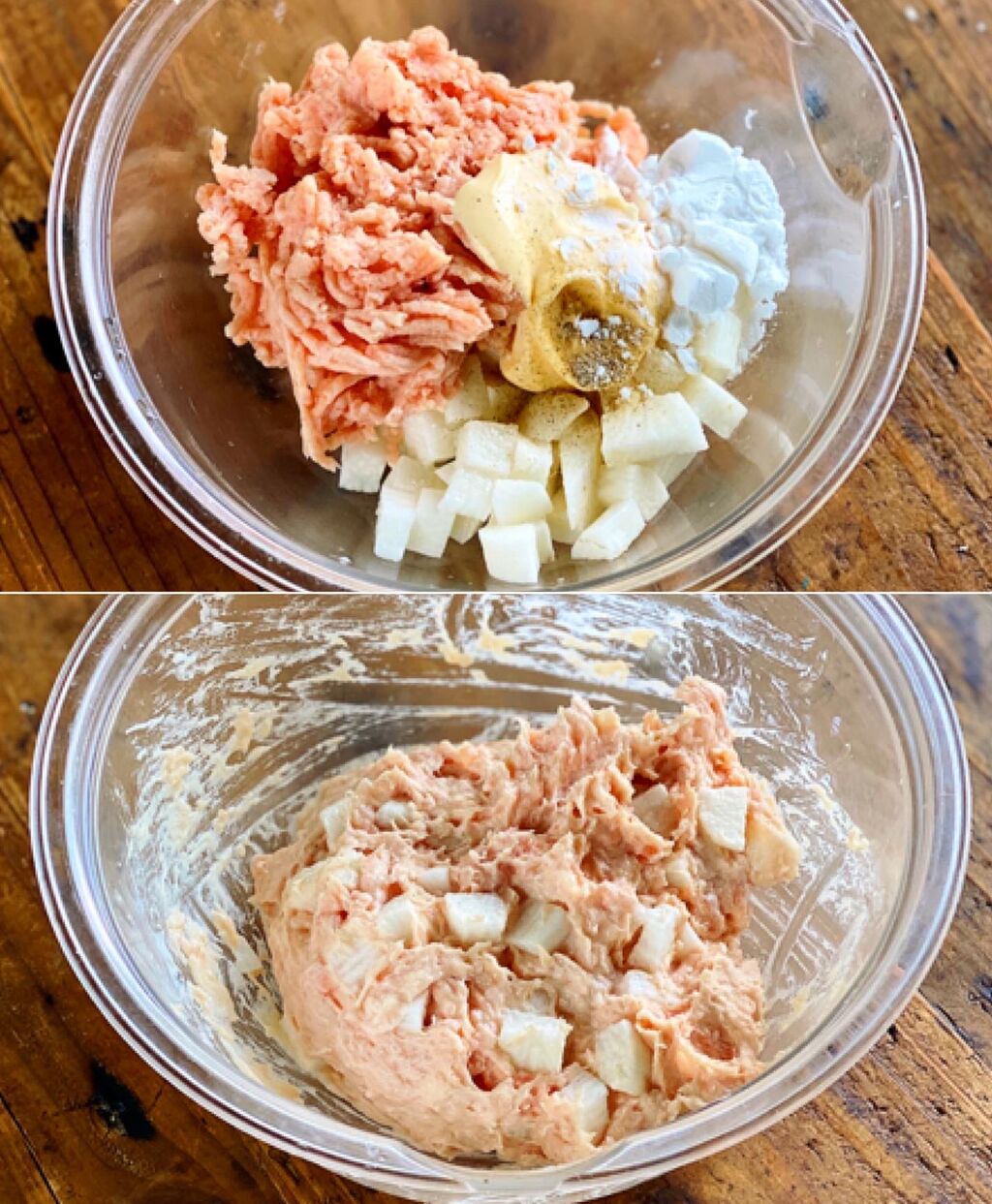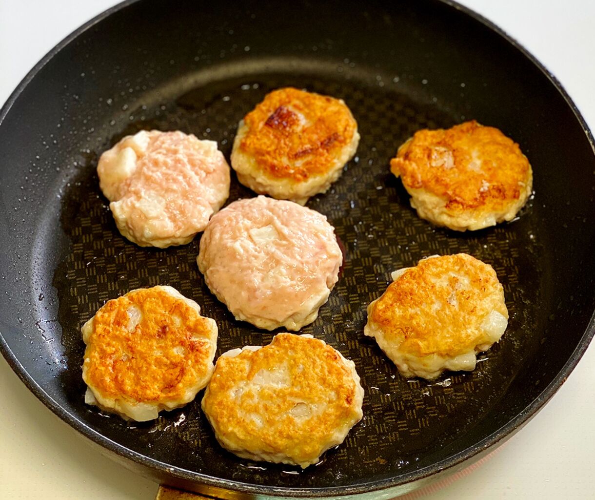 1.長芋は8mm角に切る。ボウルにひき肉、長芋、●を入れてよく混ぜ、6~7等分に分ける。☆は合わせておく。