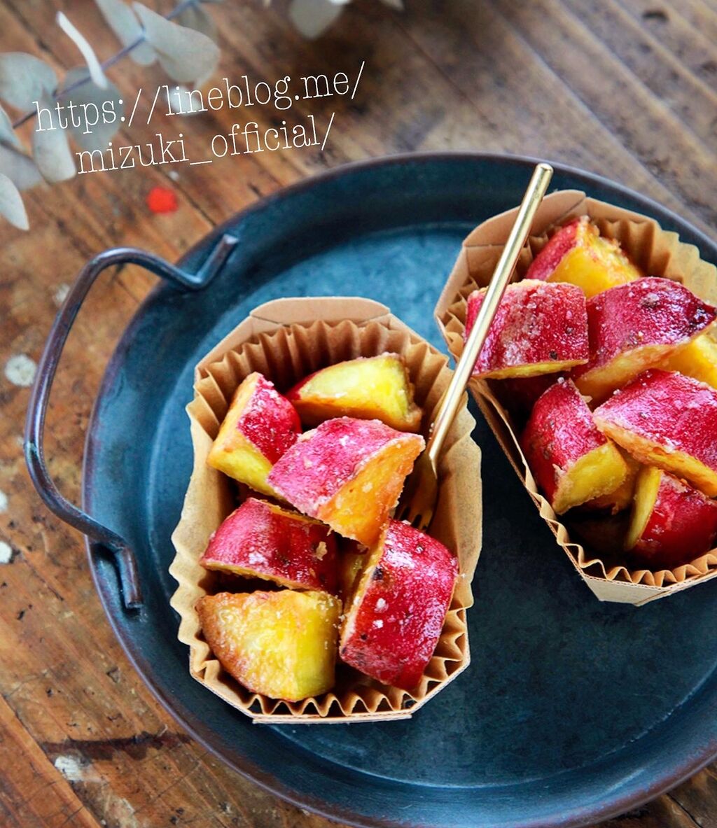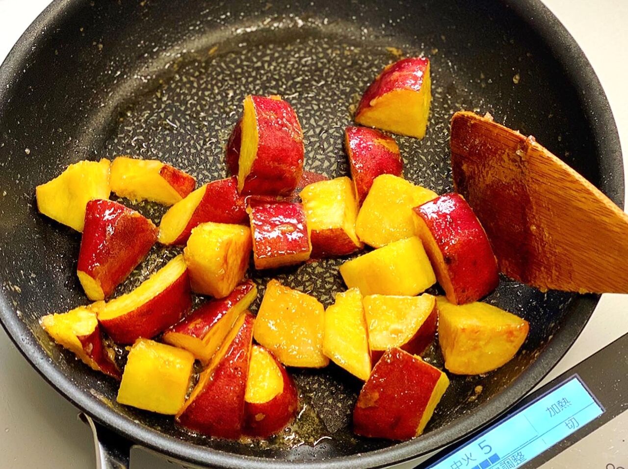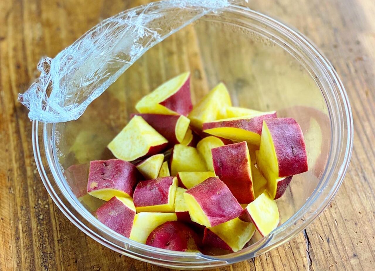 1.さつまいもは皮ごと3cm大に切り、水に3分晒して水気を切る。耐熱ボウルに入れてふんわりラップし、600Wのレンジで4分加熱する。