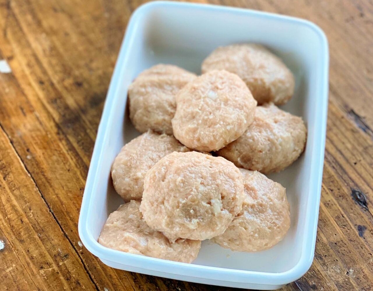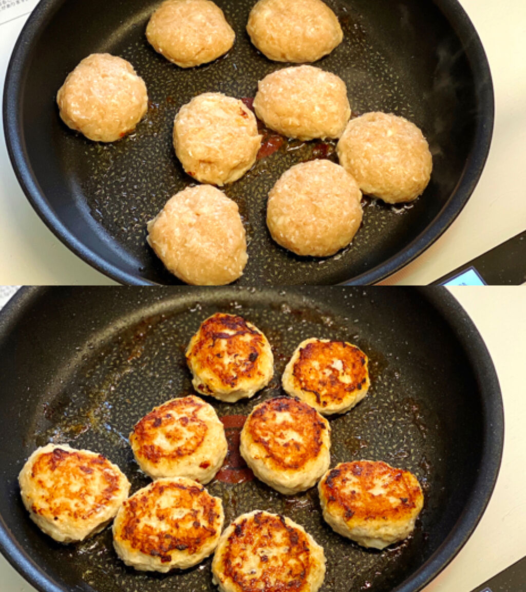 1.ボウルに●を入れてよく混ぜ、8等分の小判形にする。