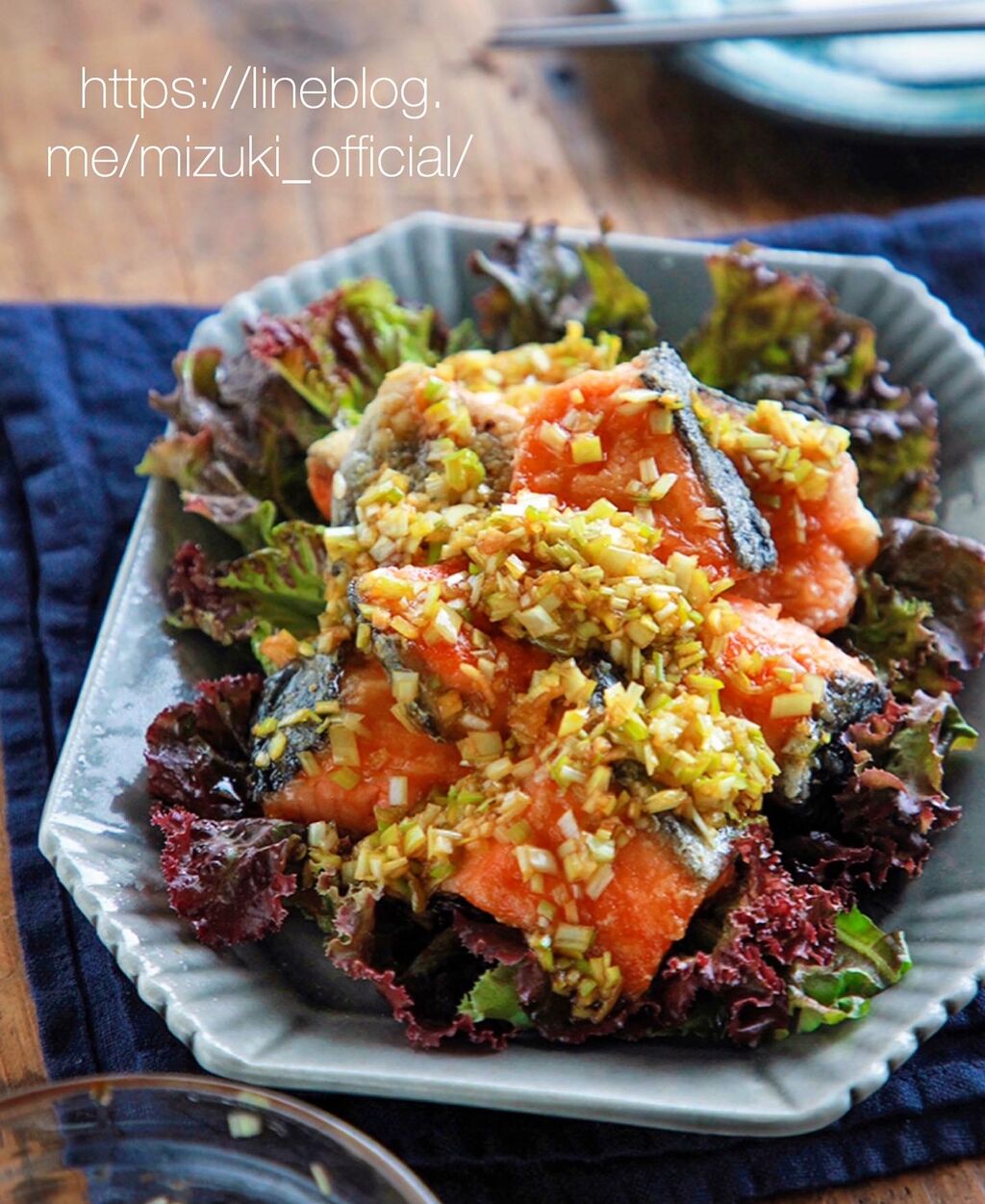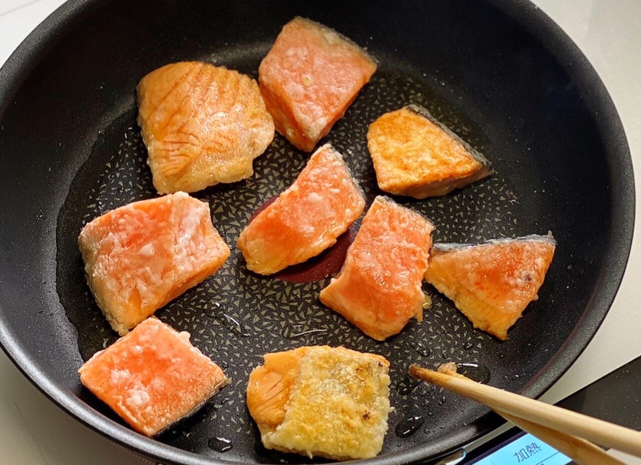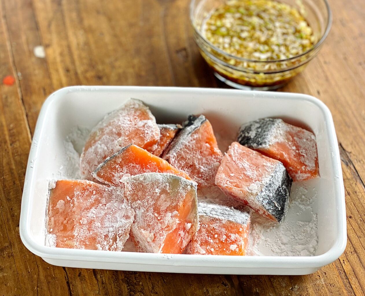 1.●を合わせて香味だれを作る。鮭は4等分に切り、塩こしょうを振って片栗粉をまぶす。